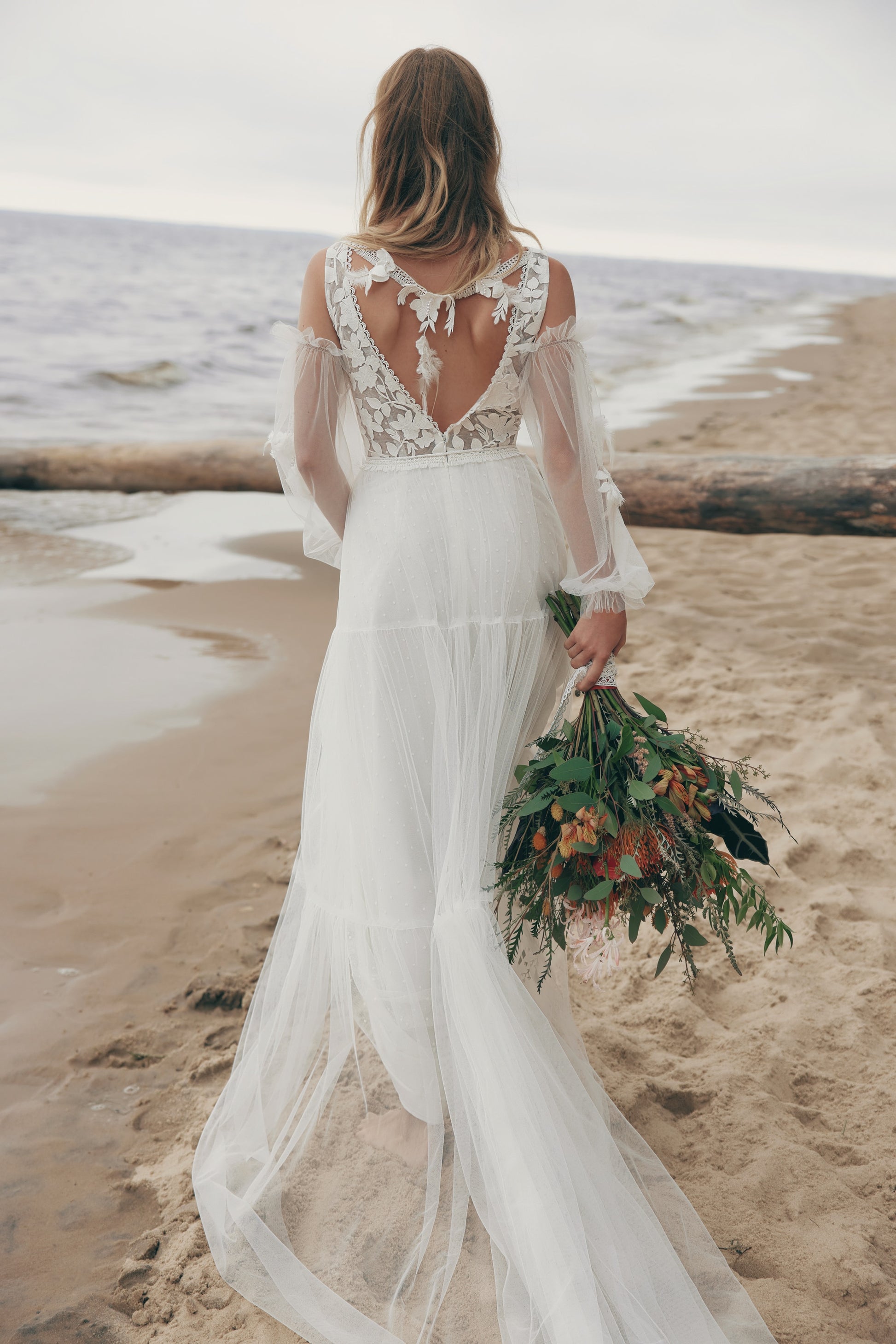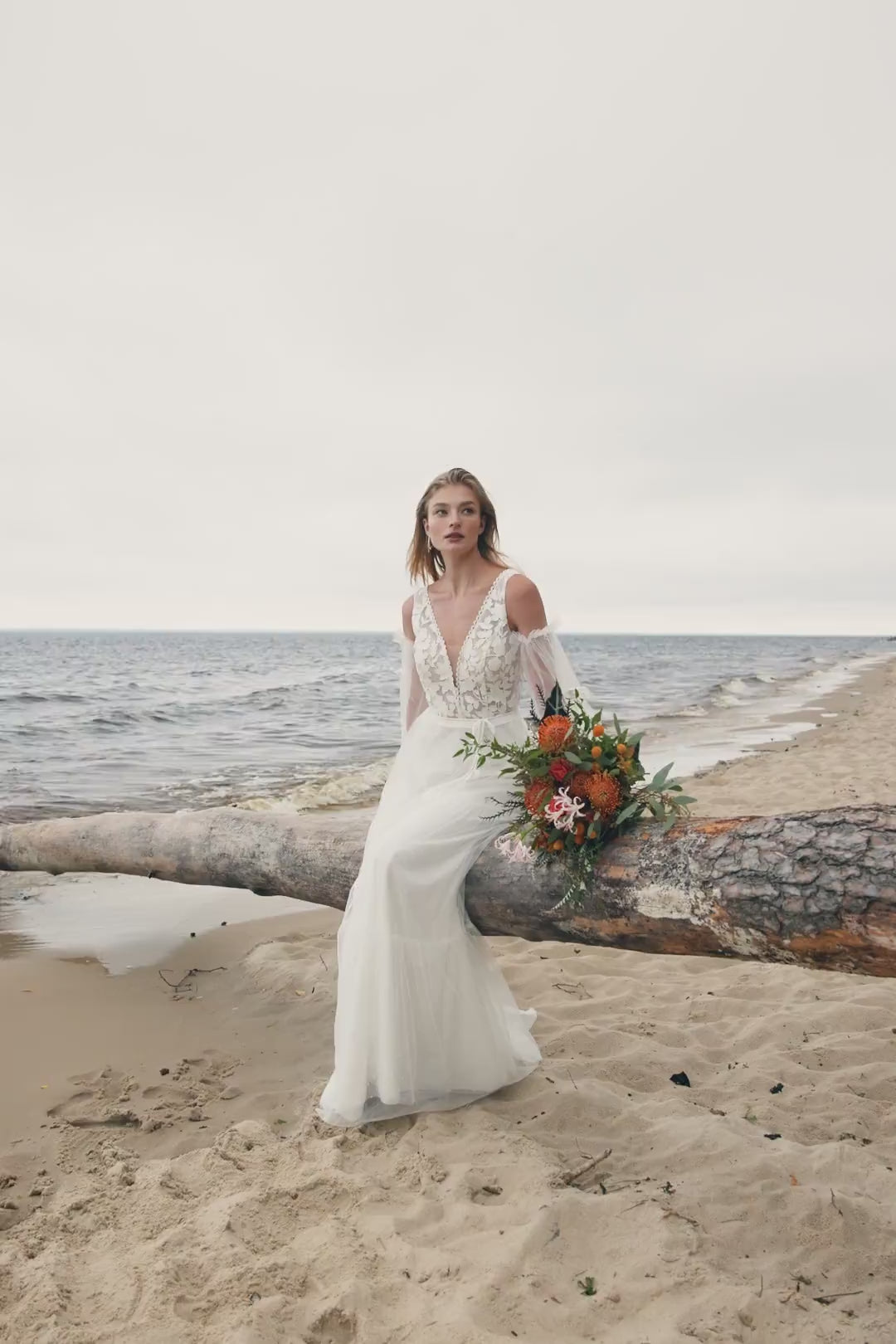 “Beautiful in White” is an intriguing A-line wedding dress blending romance with elegance. Its delicate flowered lace, dotted tulle, and dreamy layers of soft tulle create a flowing, ethereal silhouette, ideal for boho fashion-forward brides. The V-neckline draws attention to the decolletage beautifully, while macrame ribbons and a handmade pearl-embellished belt subtly enhance the waist with luxurious detail. Adding charm and versatility, the dress includes detachable sheer sleeves, offering a whimsical, bohemian flair perfect for transitioning seamlessly from ceremony to celebration.