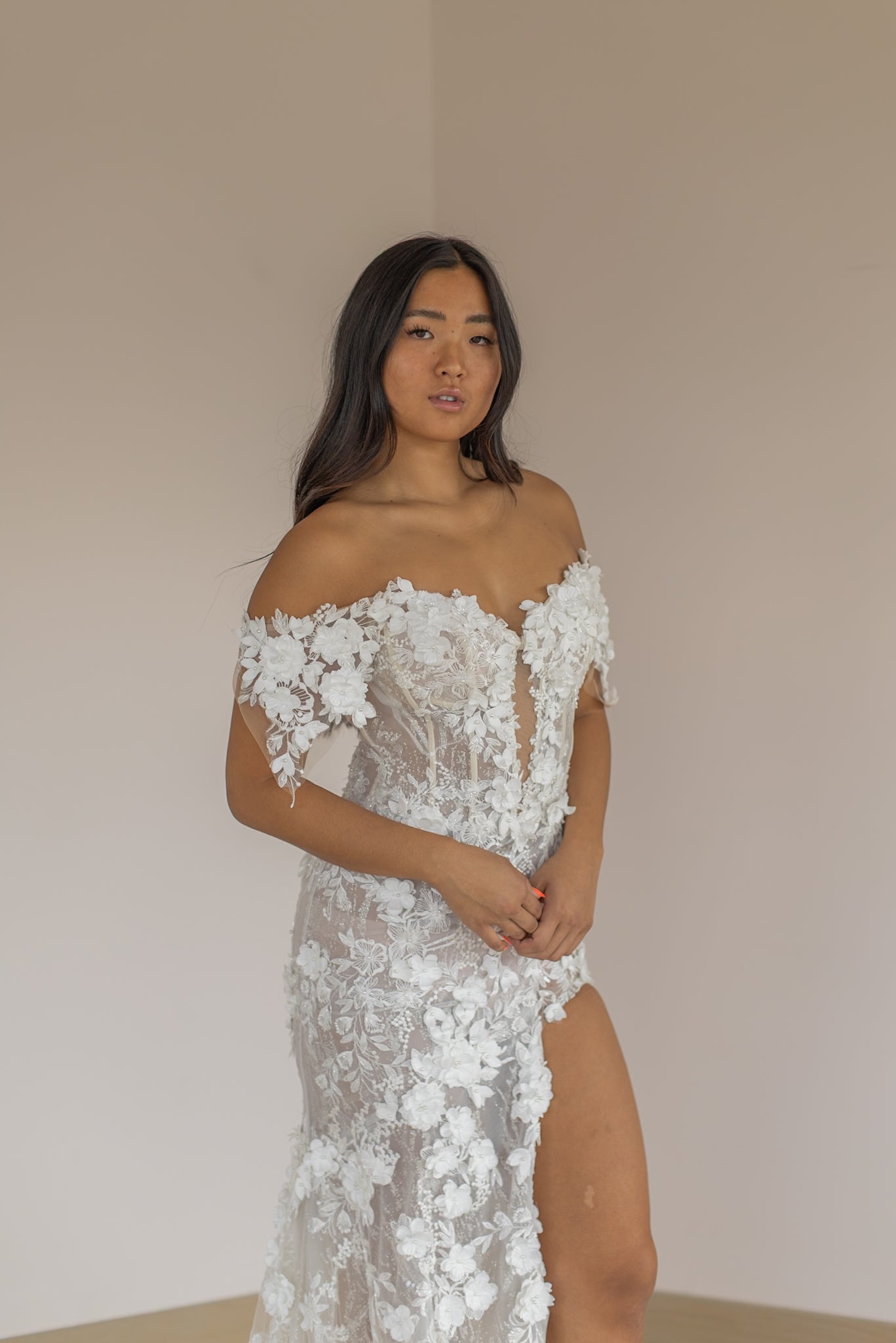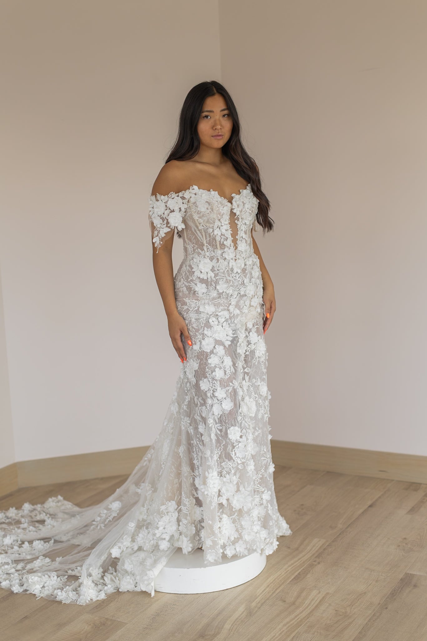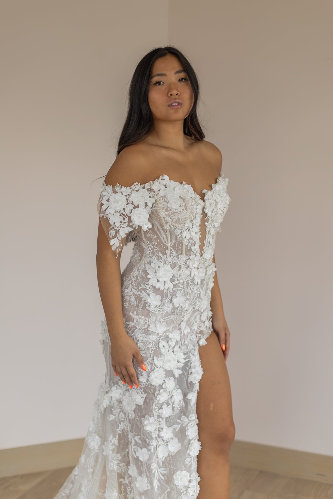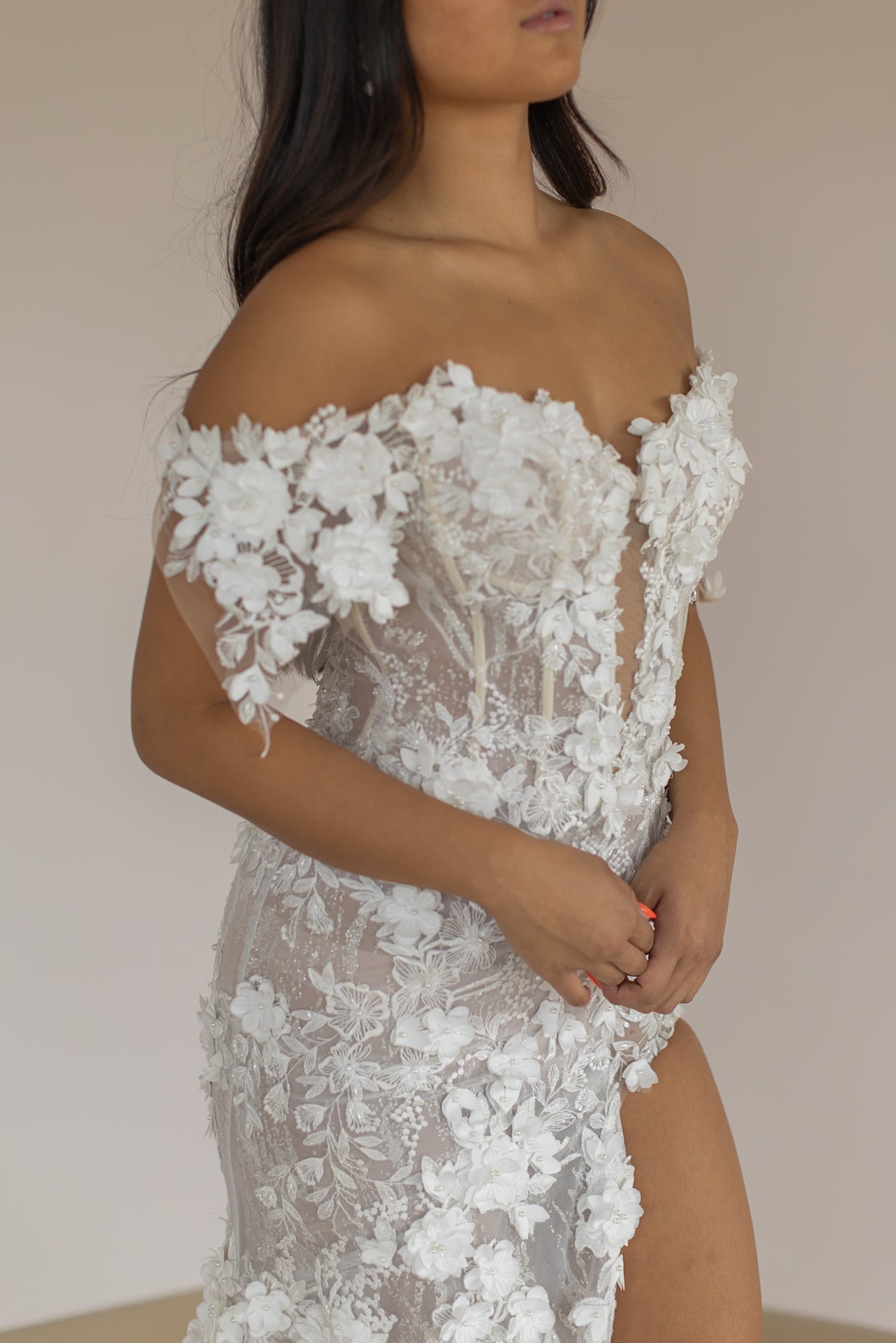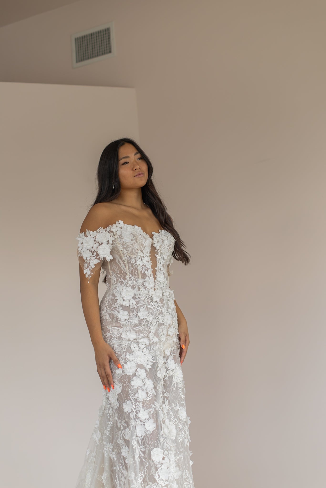 Bridal sizing runs on average 2-3 sizes SMALLER than standard street sizing. Please measure and view the size chart above to ensure that you are getting the most accurate size. If your bust, waist, and hip are measuring at different sizes, we recommend to always size up and use alterations to achieve a perfect fit. For measuring, please measure around the fullest part of your bust (the apex of your bust), your waist, and the fullest part of your hips. Size chart is highlighted above the "Add to Cart" button for reference.