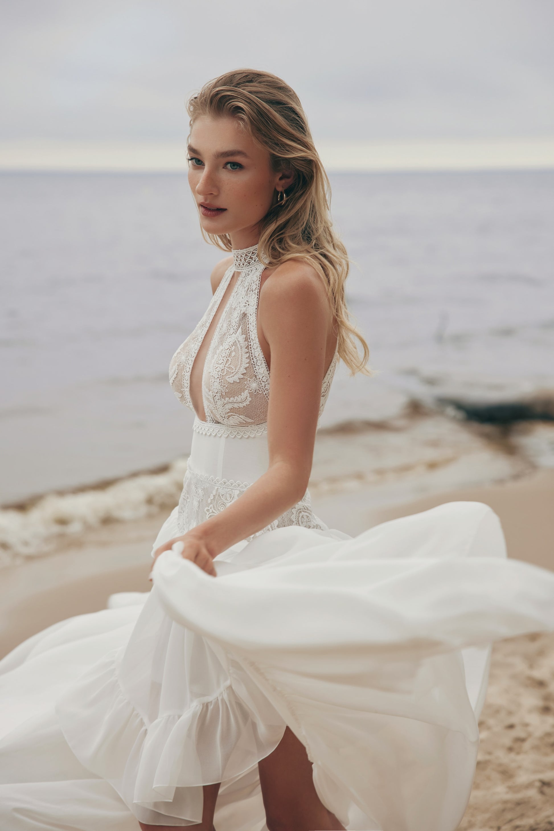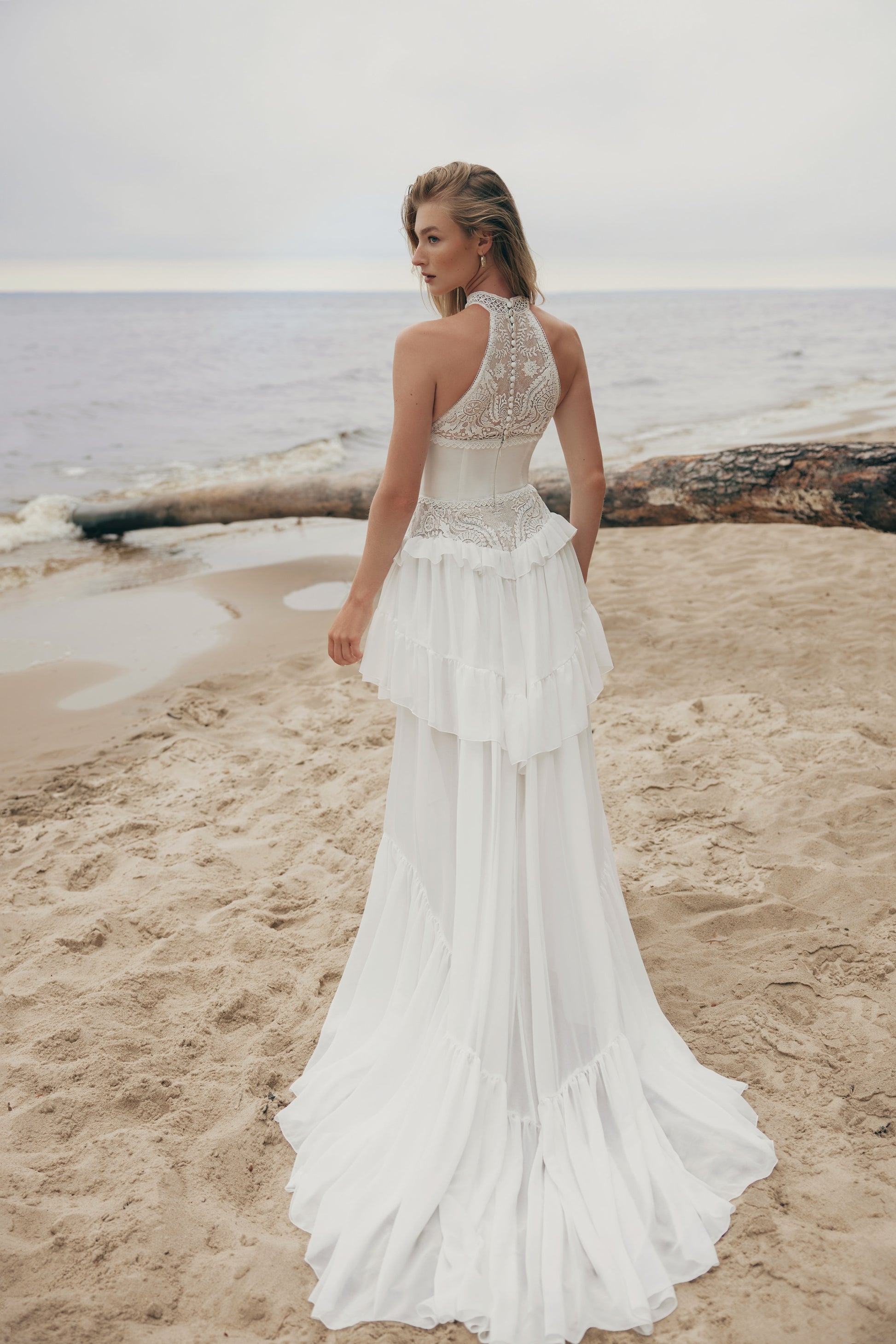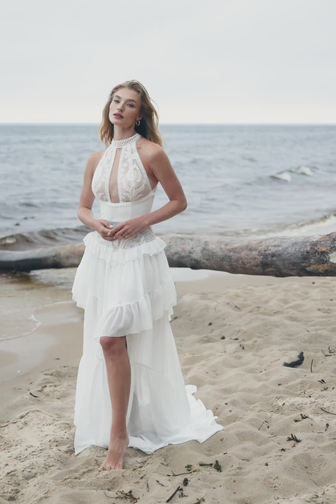 The “Blue Moon” gown is a stunning bohemian wedding dress that beautifully showcases natural elegance combined with modern charm. Crafted from flowing chiffon and delicate lace, its A-line silhouette cascades gracefully, offering brides a light, heavenly feel. The halter neckline highlights the shoulders and neckline with intricate lace accents and macramé ribbon braiding on the bodice, creating a textured, artistic look. Its soft chiffon layers flow into a tiered skirt that moves effortlessly with every step, while the high neckline adds a touch of sophistication.