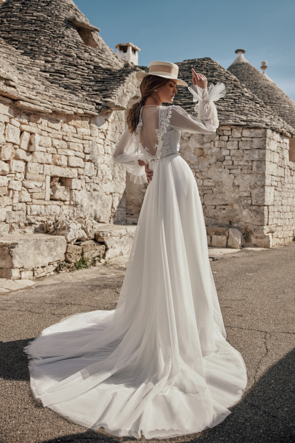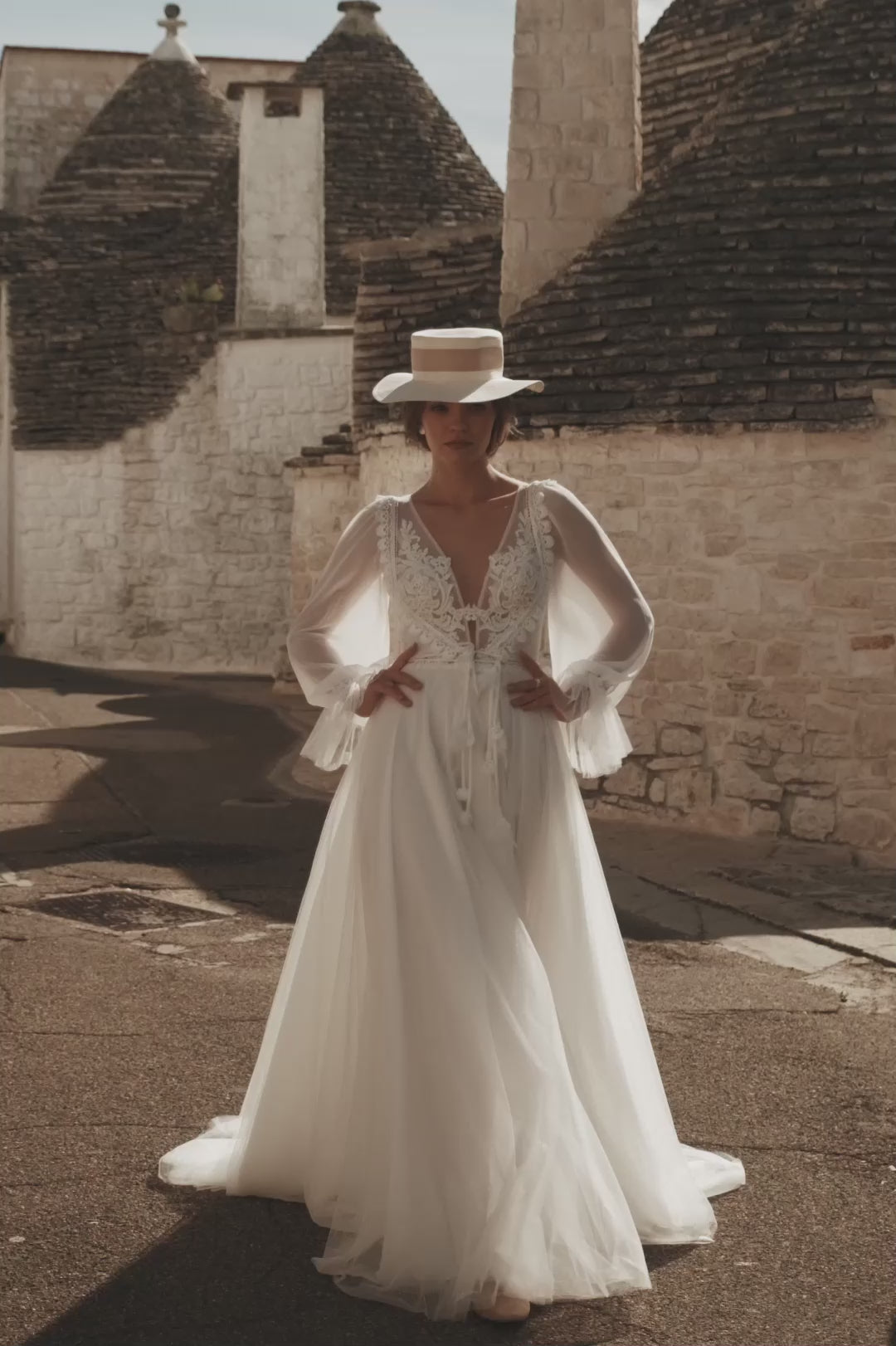 The Cadence by Ariamo Boho wedding dress embodies effortless elegance with its flowing silhouette and intricate details. This gown captures the essence of bohemian charm, providing a romantic and natural look that feels both comfortable and timeless. Perfect for brides seeking a graceful and free-spirited style, Cadence ensures you shine beautifully on your special day.