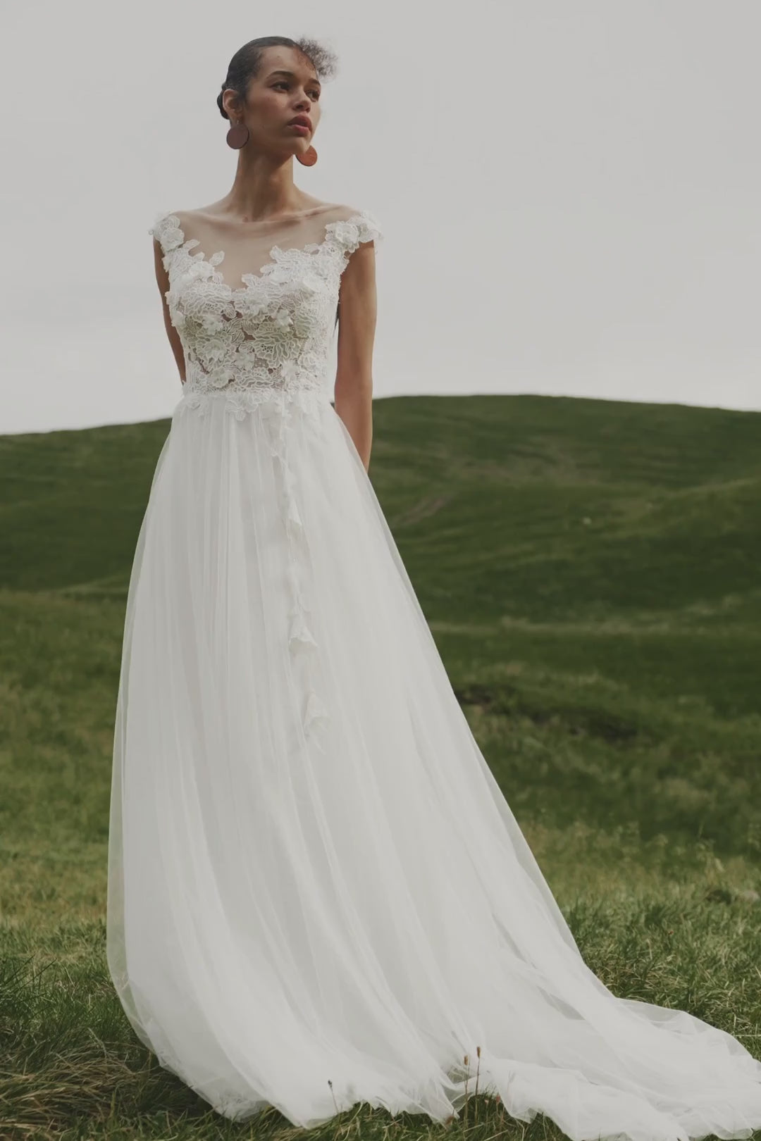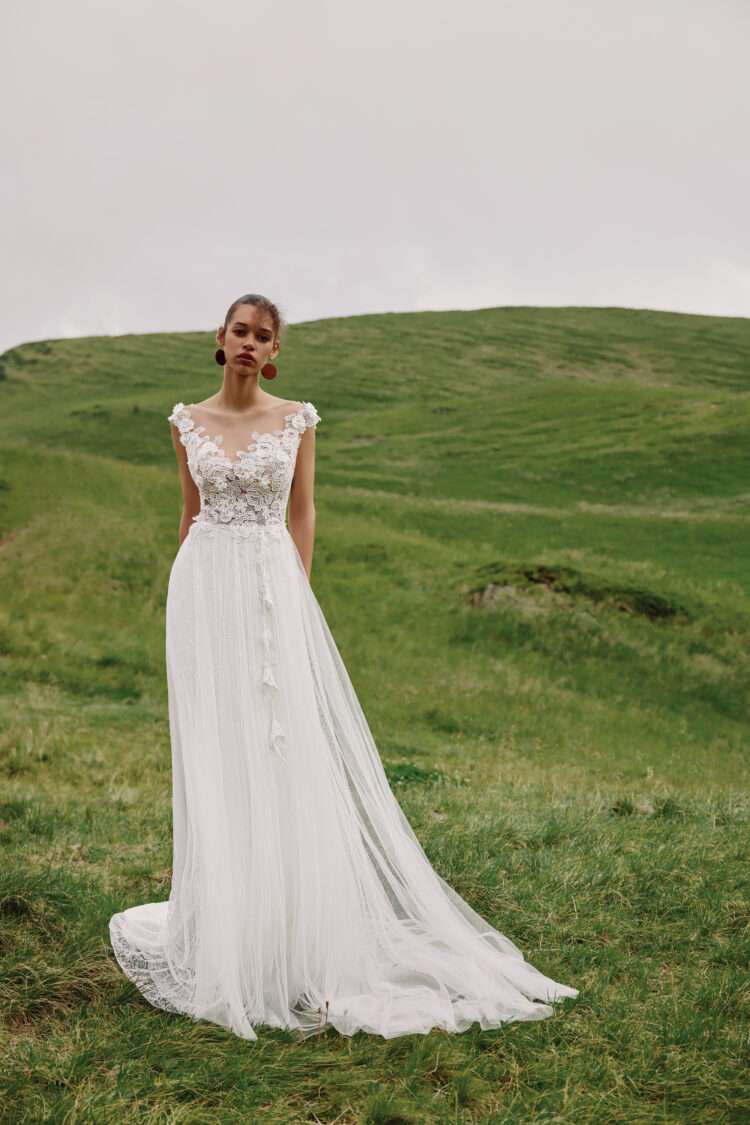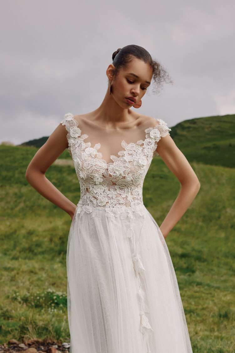 Incredibly soft and feminine A-line wedding dress is designed to create a truly airy and romantic bridal look. The scoop transparent bodice with open back is decorated with the 3D lace flower appliques. Due to the multi-layered skirt made of lace and tulle and soft chapel train the whole outfit looks really airy and, at the same time, luxurious. Both back and waist are completed with hand-woven cords decorated with feathers and handmade flowers. Such details make the bridal look especially soft and angelic.
