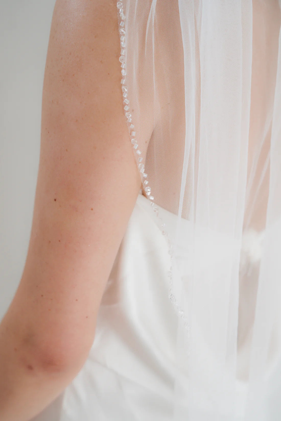 Introducing the Celeste Veil, timeless elegance redefined. This fingertip-length style is crafted from our signature Heirloom Tulle™ and delivers a featherlight drape with a luxuriously soft hand feel that feels like a second skin. The classic silhouette is finished with a hand-sewn glass bead trim that adds subtle texture and dimension without overwhelming your look. Versatile and refined, Celeste pairs beautifully with both minimalist and romantic gowns, making it the perfect choice for any bridal aesthetic. Choose this veil for understated sophistication that lets your beauty shine on your most cherished day.