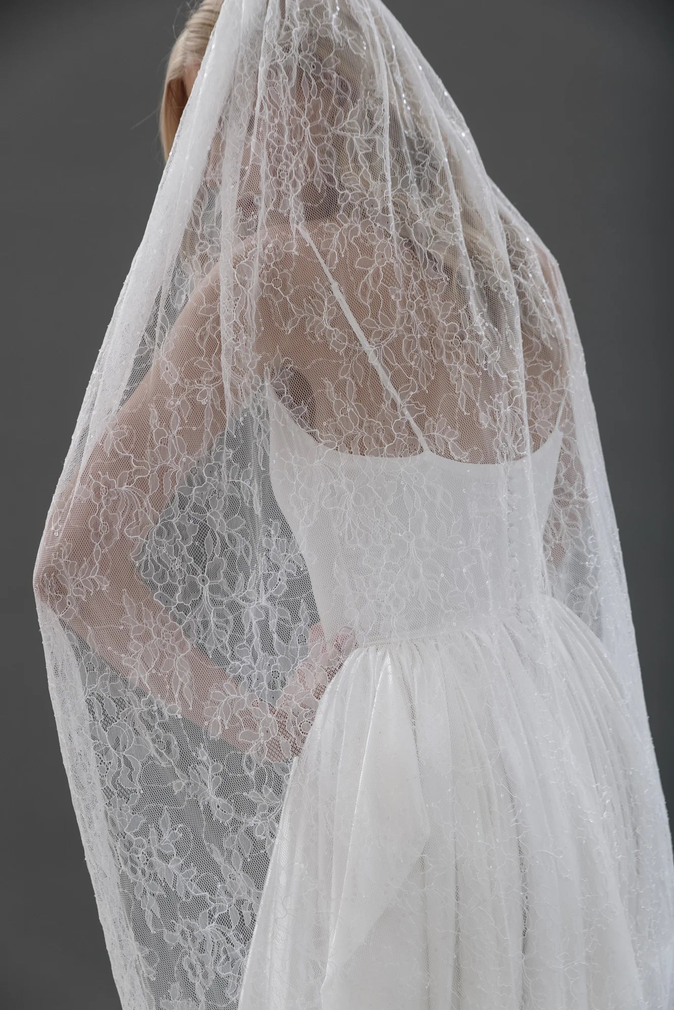 Create a unique bridal look with our V2415 veil, crafted with luxurious Chantilly lace and adorned with delicate sequins for a subtle sparkle. Fingertip or cathedral length options make this veil the perfect finishing touch, adding texture and glamour to any ensemble.