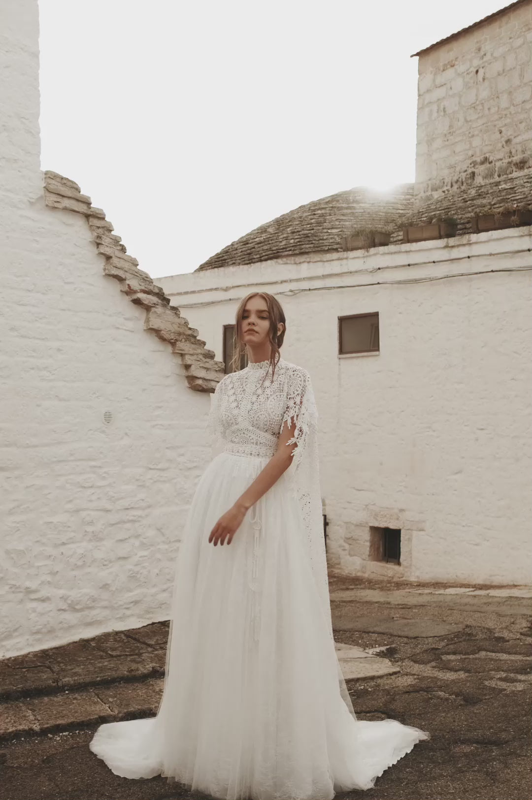 The Charms by Ariamo Boho wedding dress features a unique lace design that beautifully highlights its bohemian spirit. With its flowing silhouette and intricate lace details, this gown offers a romantic and natural look while ensuring comfort throughout your special day. Perfect for brides who want to express their individuality with timeless elegance.