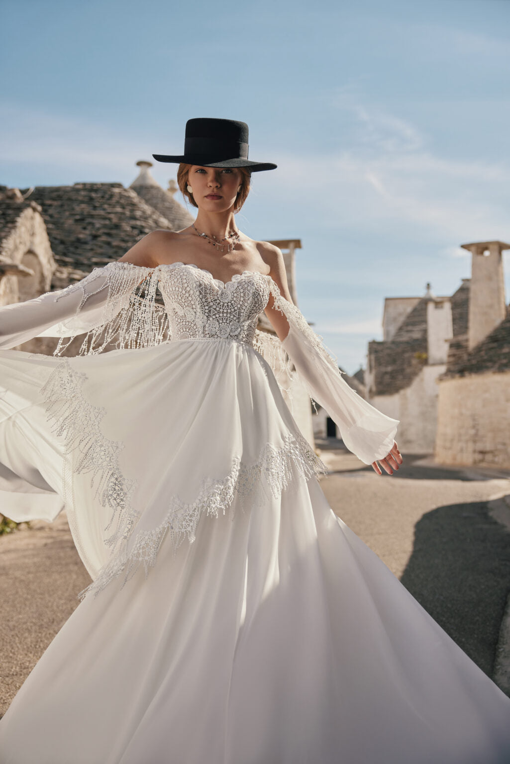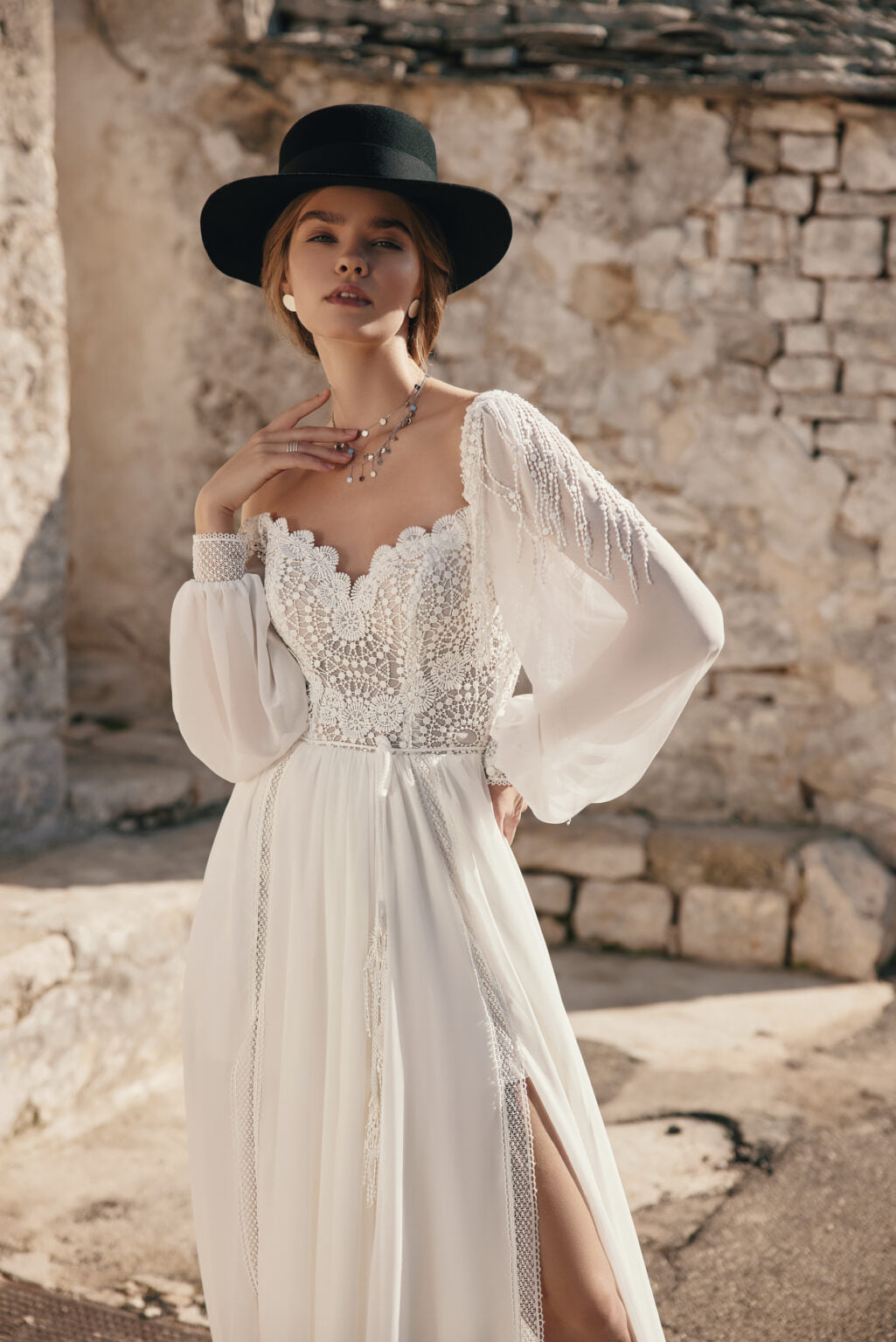 The Daydream by Ariamo Boho wedding dress features a unique lace design that beautifully highlights its bohemian spirit. With its light flowy silhouette and intricate lace details, this gown offers a romantic and natural look while ensuring comfort throughout your special day. Perfect for brides who want to express their individuality with timeless elegance.