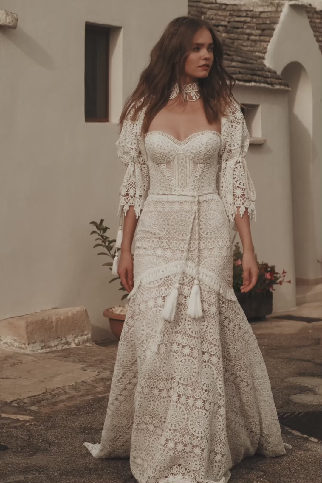 The Daydream by Ariamo Boho wedding dress features a unique lace design that beautifully highlights its bohemian spirit. With its light flowy silhouette and intricate lace details, this gown offers a romantic and natural look while ensuring comfort throughout your special day. Perfect for brides who want to express their individuality with timeless elegance.