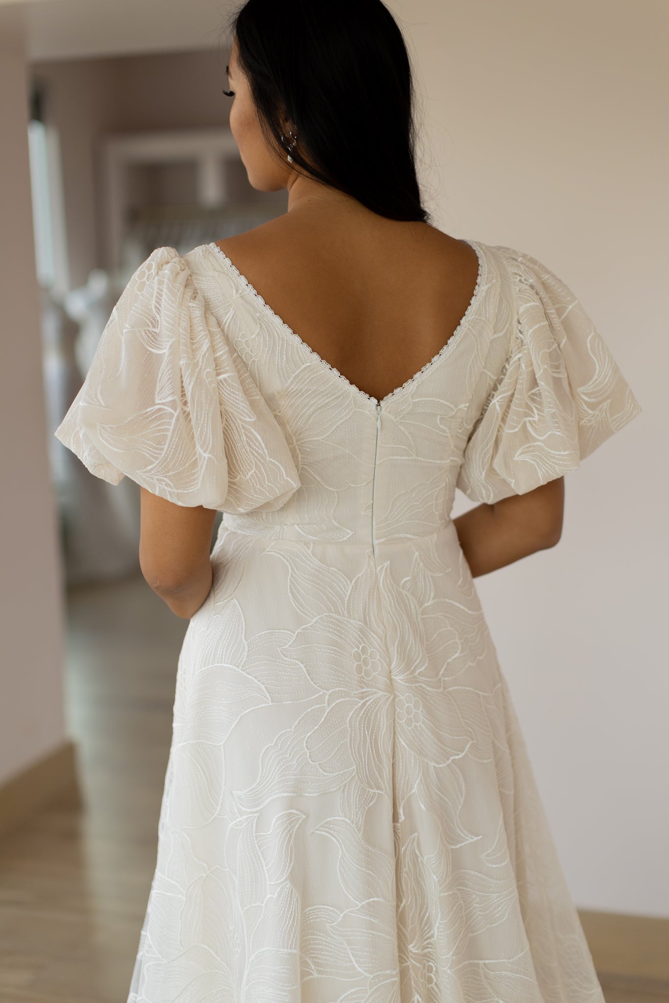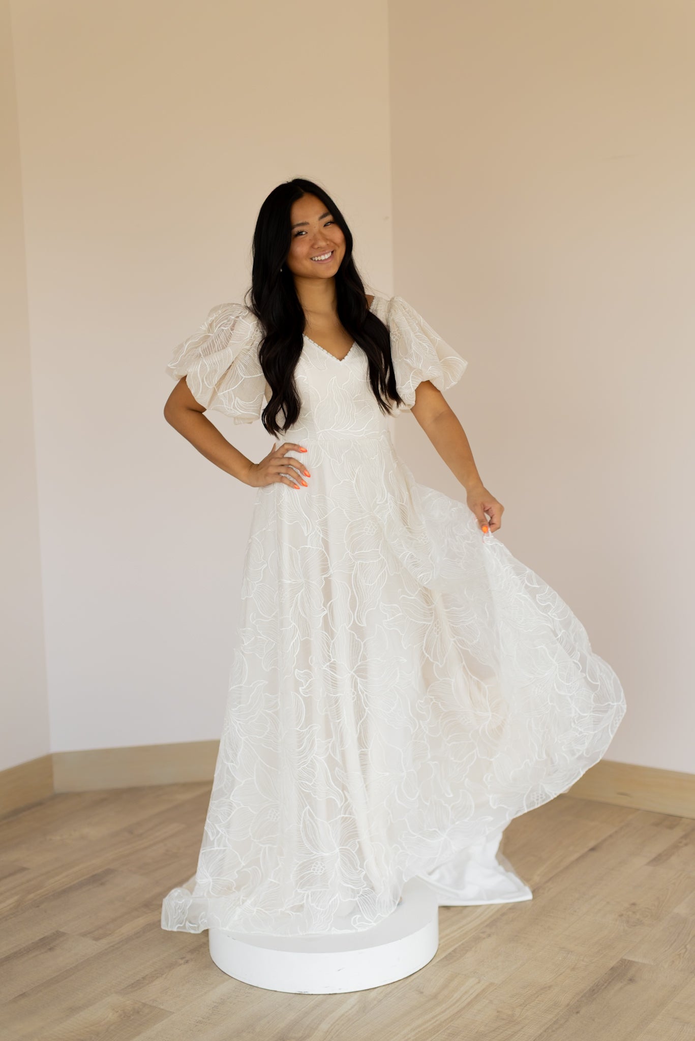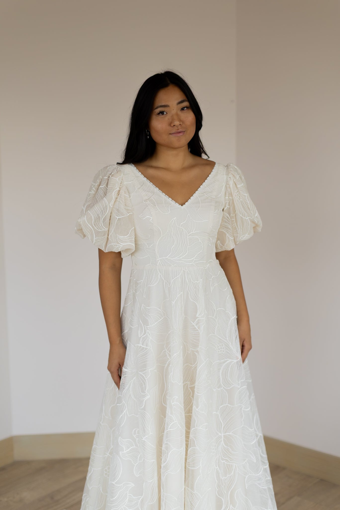 Elowen by Ariamo showcases a stunning V-neck silhouette complemented by romantic puff sleeves for a touch of vintage elegance. The unique floral lace embellishes the flowing A-line skirt, adding delicate texture and timeless beauty. This dress is perfect for brides looking to combine classic charm with intricate details that captivate.