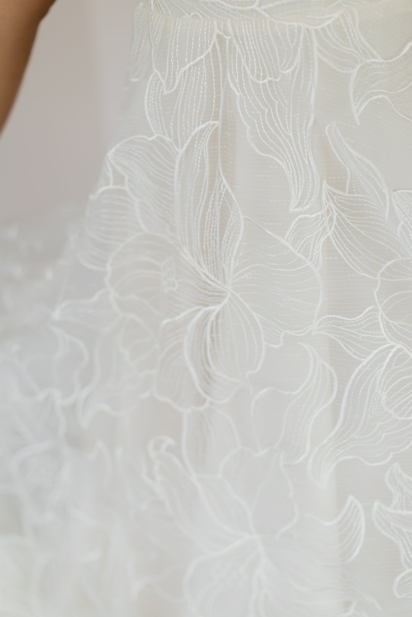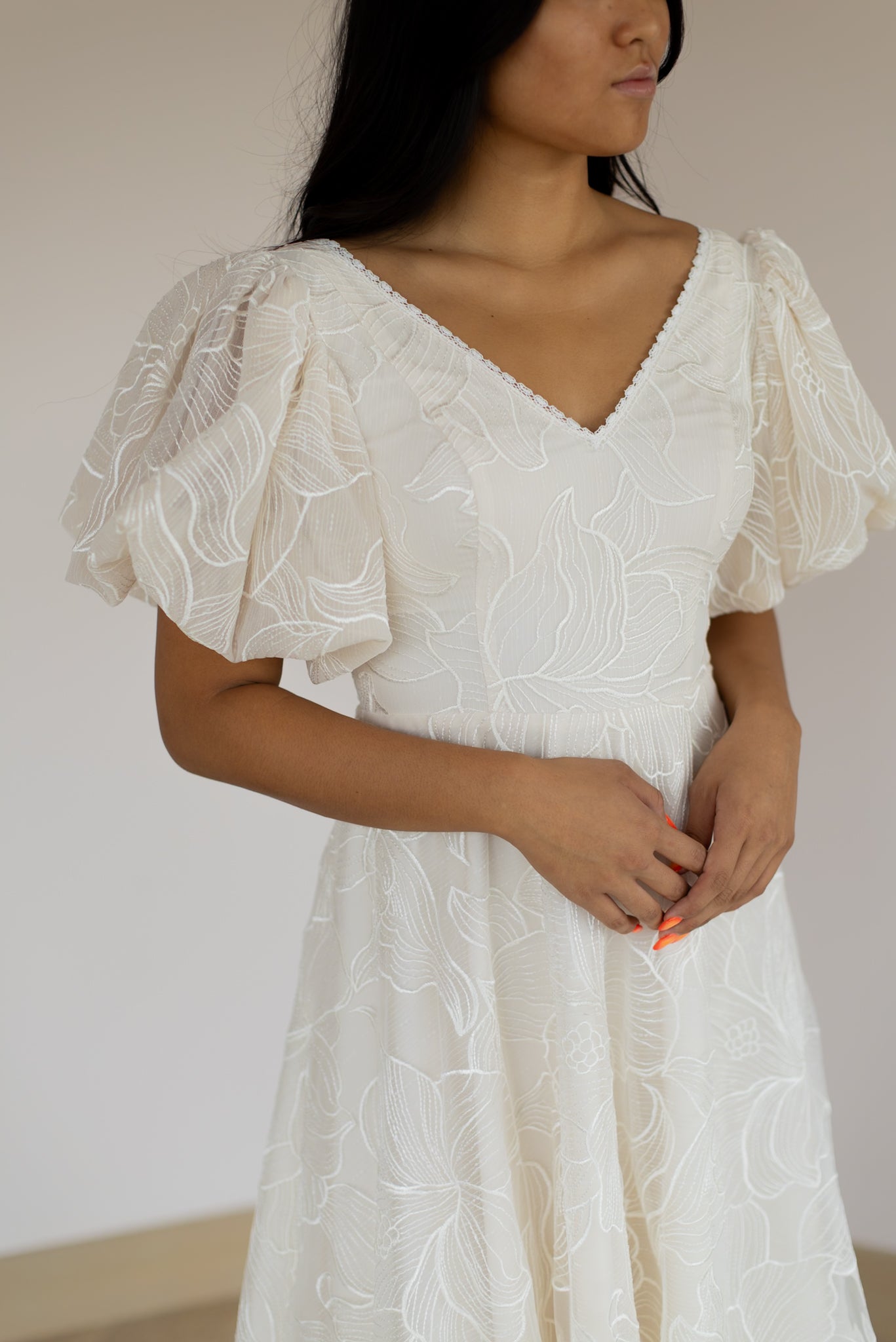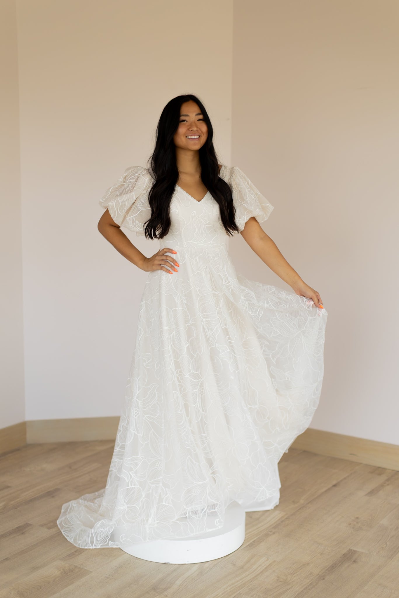 Elowen by Ariamo showcases a stunning V-neck silhouette complemented by romantic puff sleeves for a touch of vintage elegance. The unique floral lace embellishes the flowing A-line skirt, adding delicate texture and timeless beauty. This dress is perfect for brides looking to combine classic charm with intricate details that captivate.