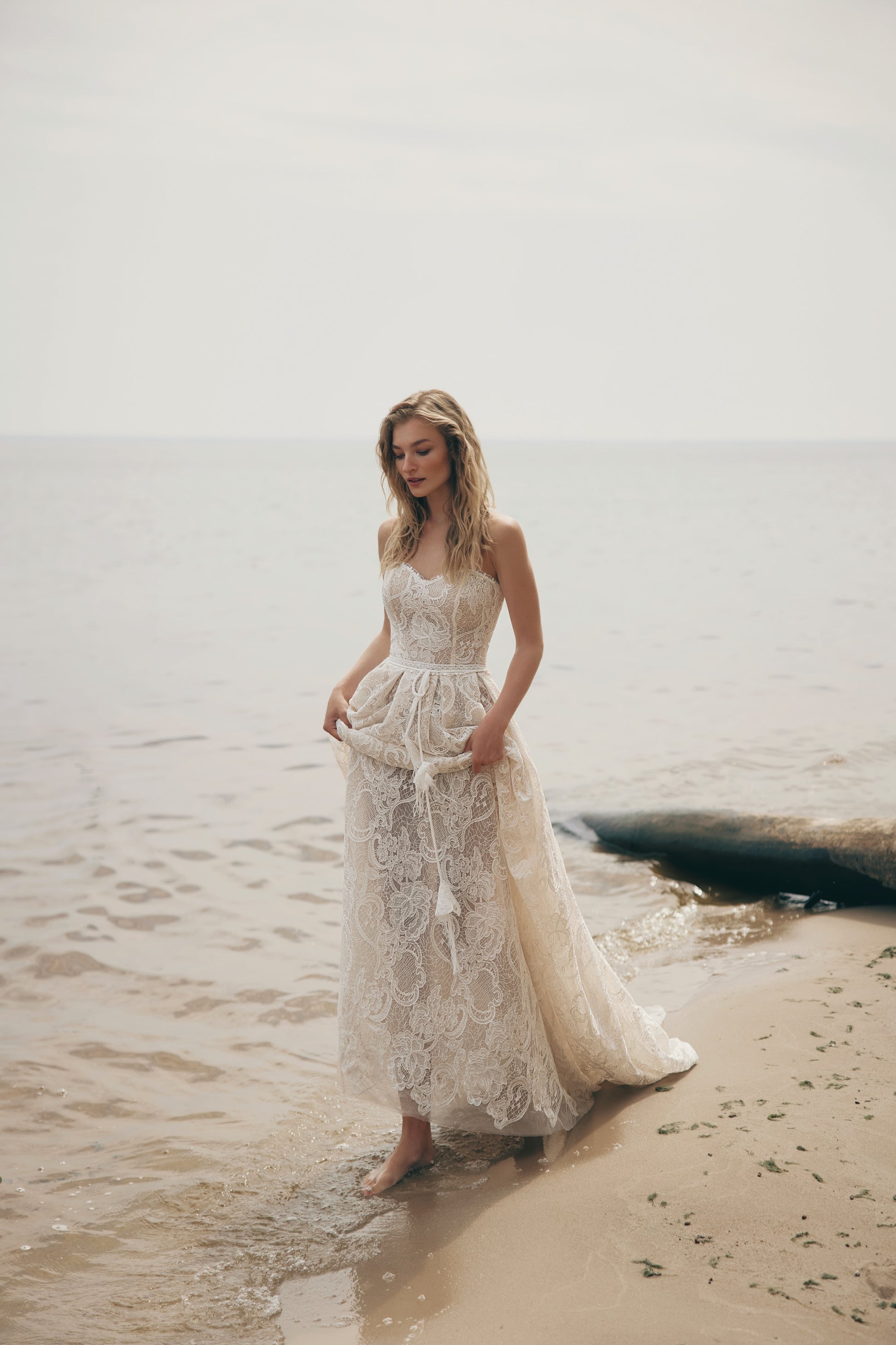 “Every Breath You Take” is a breathtakingly beautiful, boho-inspired wedding dress that just captures romance and timeless elegance. The A-line silhouette in this delicate lace, accented with macramé ribbons, cascades into a graceful train, creating a soft, ethereal effect with every step. The sweetheart neckline frames the bride’s femininity, while the handmade belt cinches the waist, adding definition and subtle charm. To add more drama and romance to the gown, it is partnered with a very beautiful bolero with flowing see-through sleeves and intricate lace details that add such a touch of royalty, which completes the bride’s look.