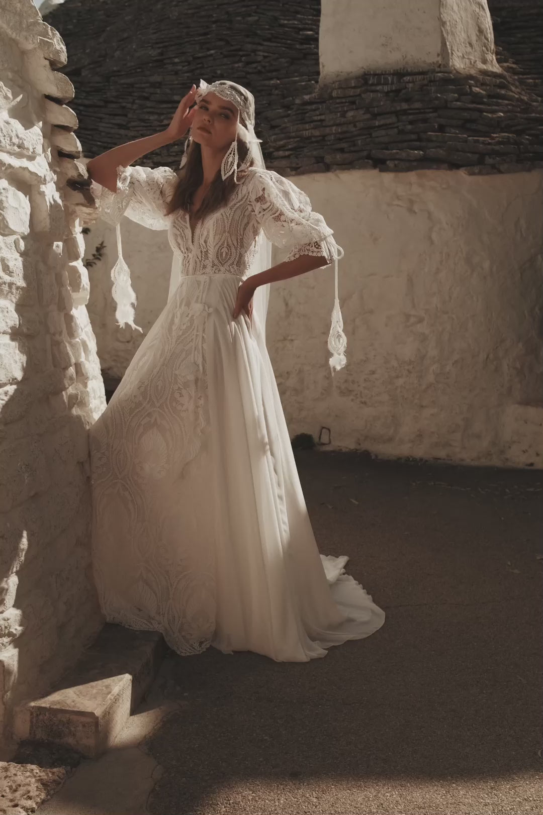 The Fiona by Ariamo Boho wedding dress features a unique lace design that beautifully highlights its bohemian spirit. With its light flowy silhouette and intricate lace details, this gown offers a romantic and natural look while ensuring comfort throughout your special day. Perfect for brides who want to express their individuality with timeless elegance.