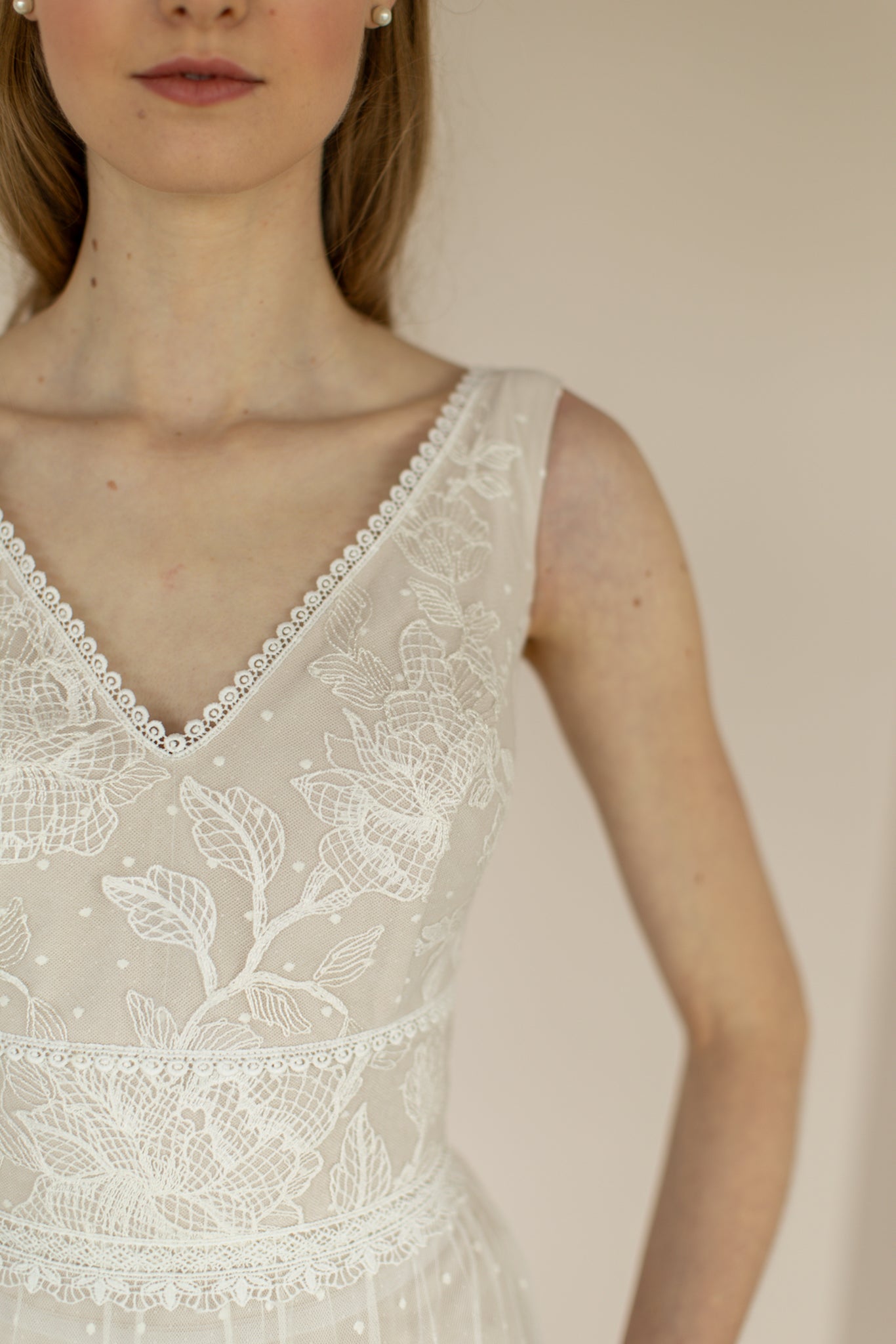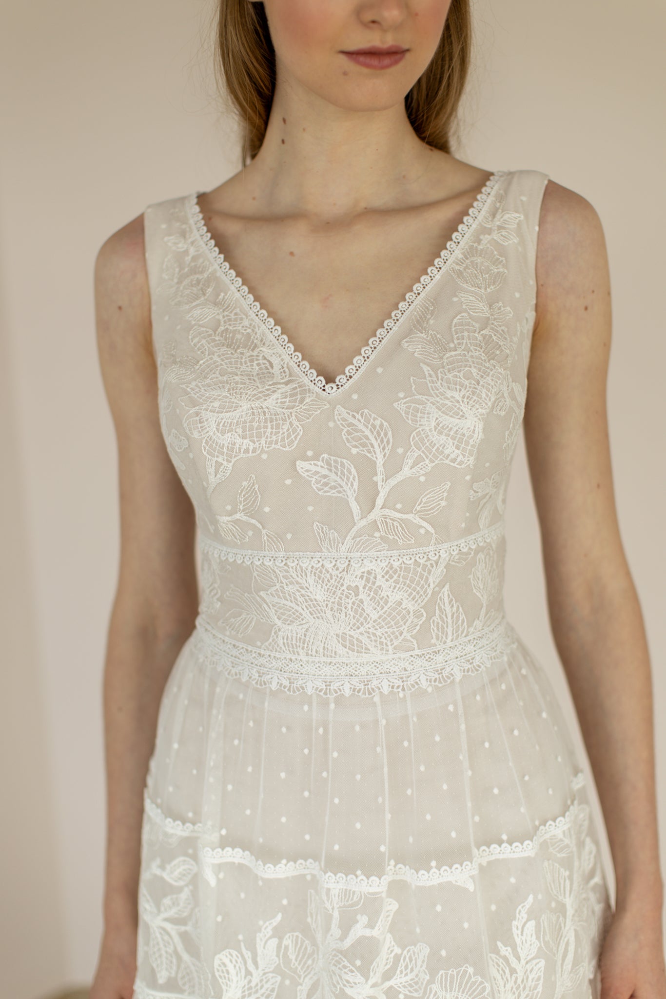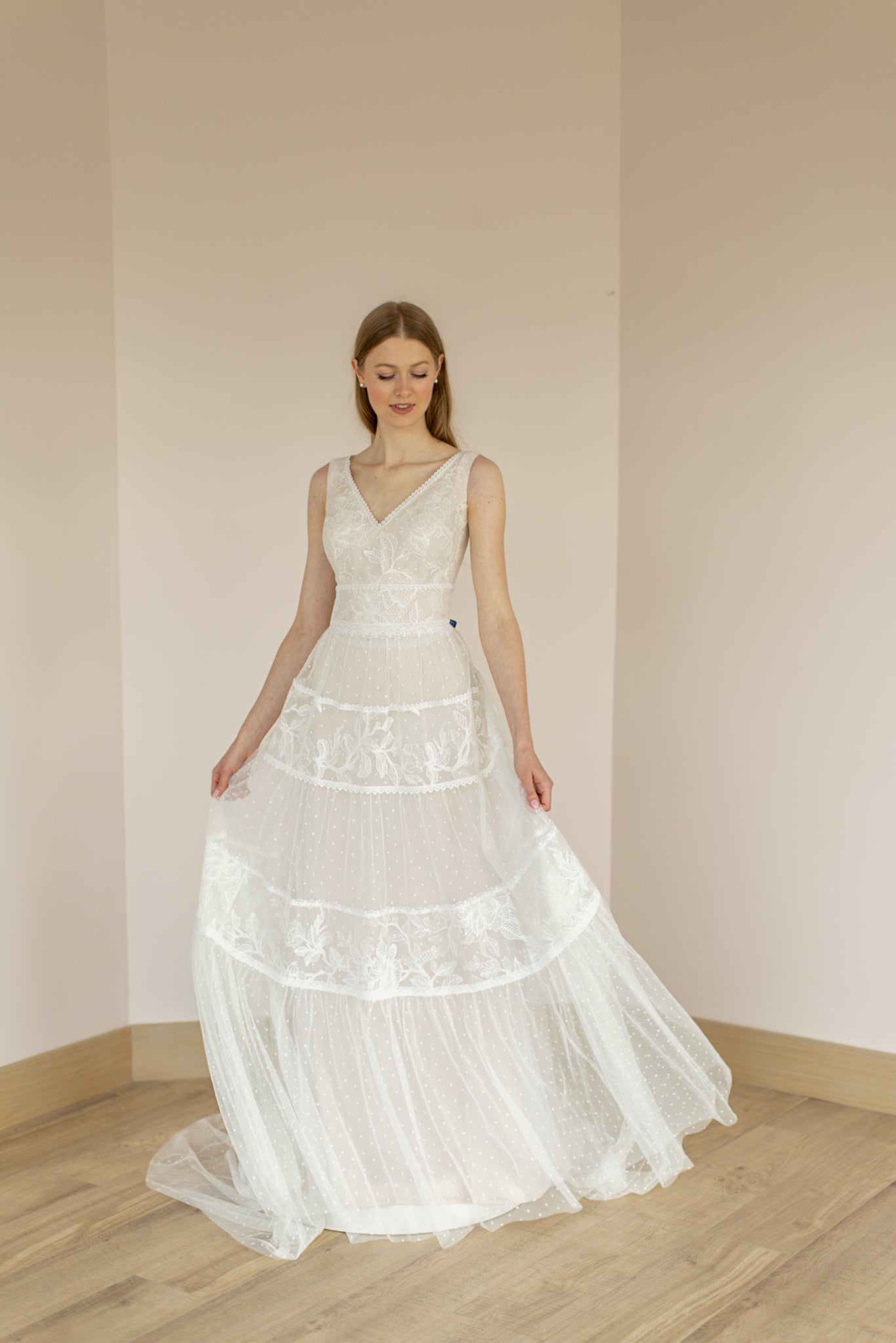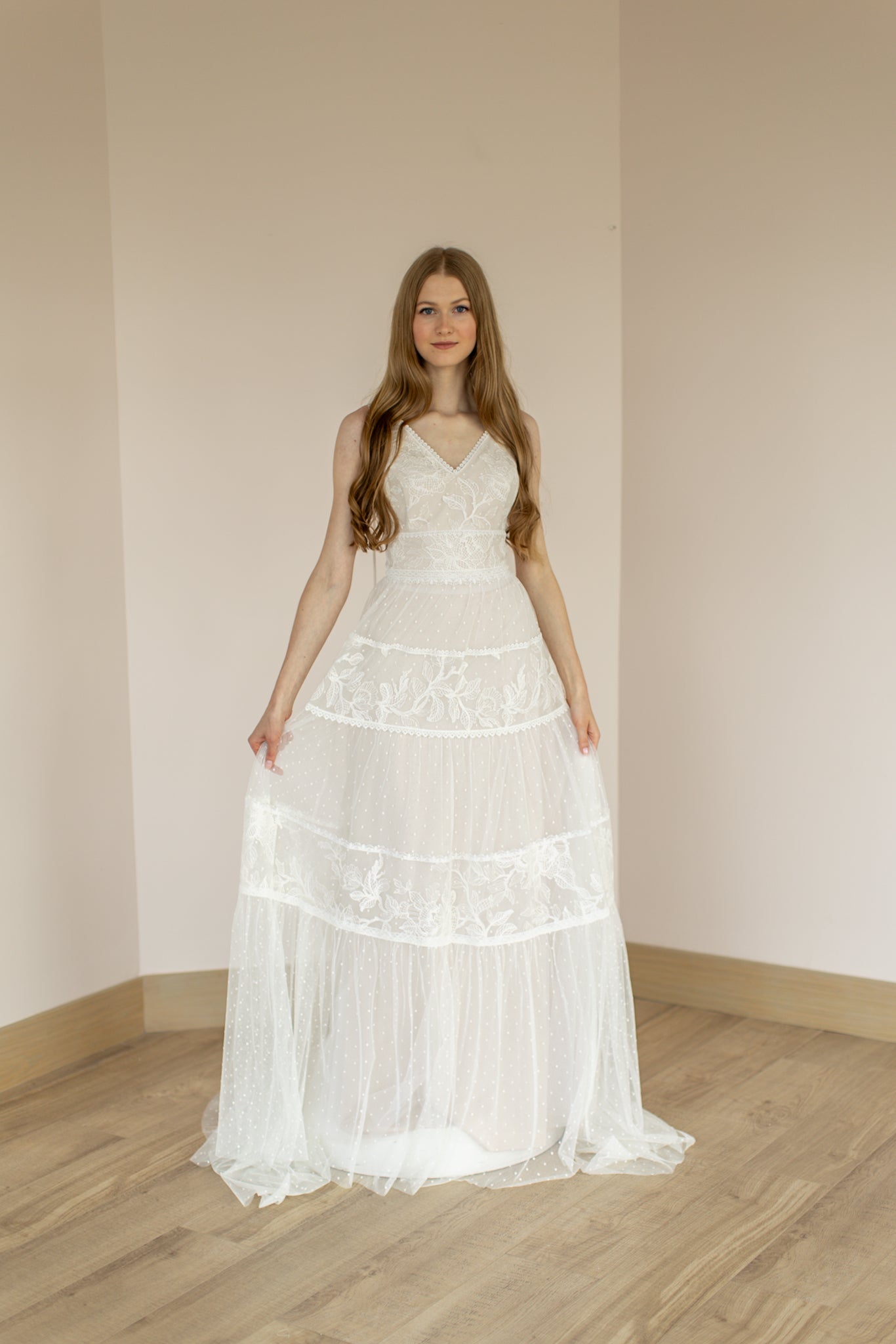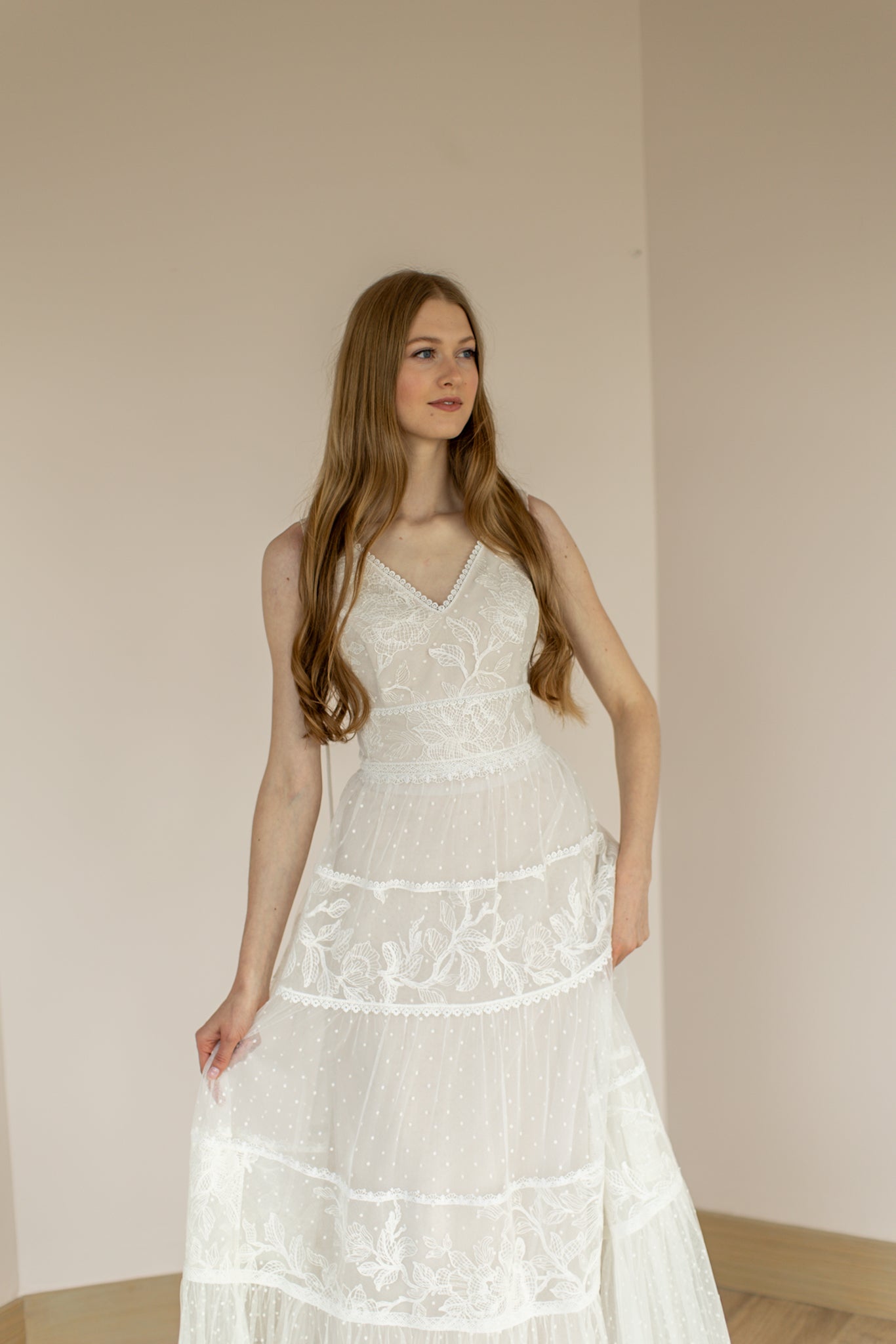 Embrace effortless elegance with the Freya by Ariamo, a lace and Swiss Dot A-line gown that captures a graceful Bohemian spirit. Featuring a flattering V-neck and a dramatic V-backline, this dress flows into a delicate lace train, perfect for a bride seeking romantic charm with a modern twist. Its lightweight design ensures comfort while making every step memorable. Ideal for those who want a timeless yet free-spirited look on their special day.