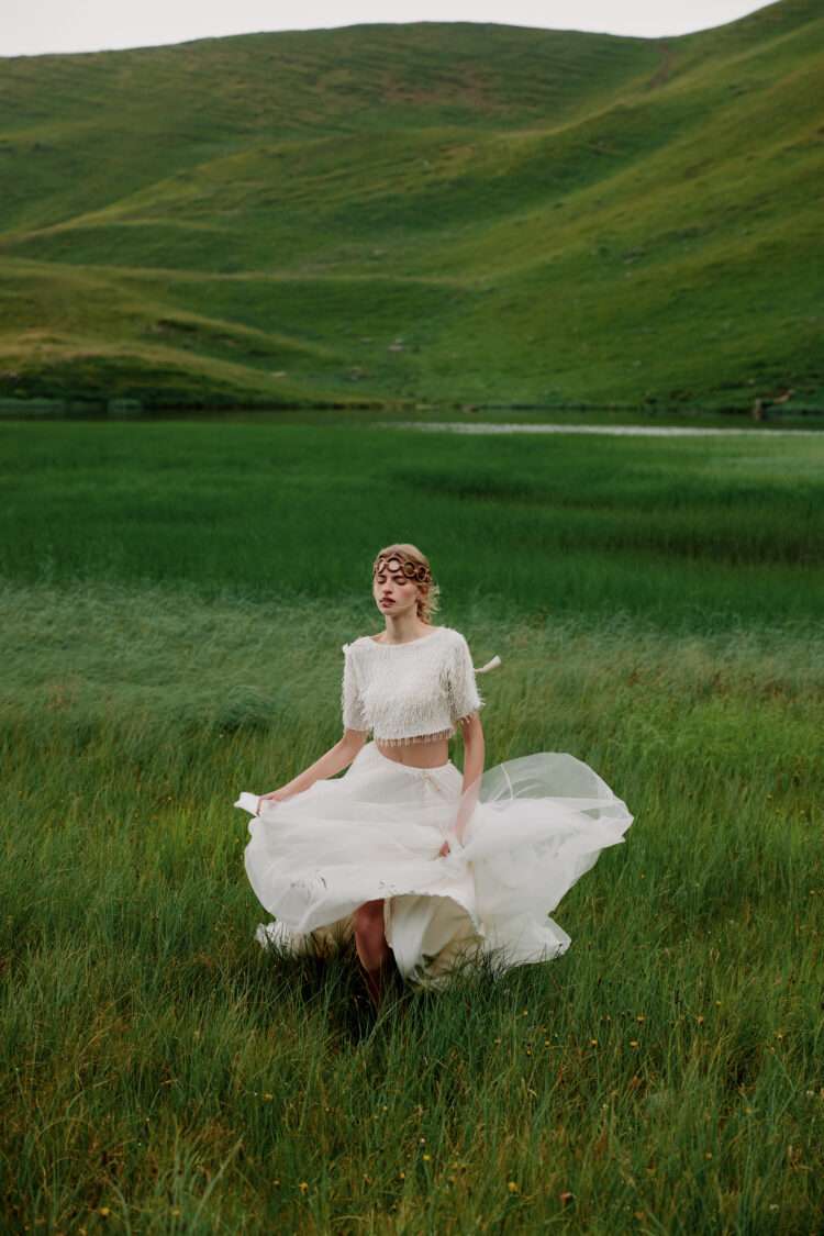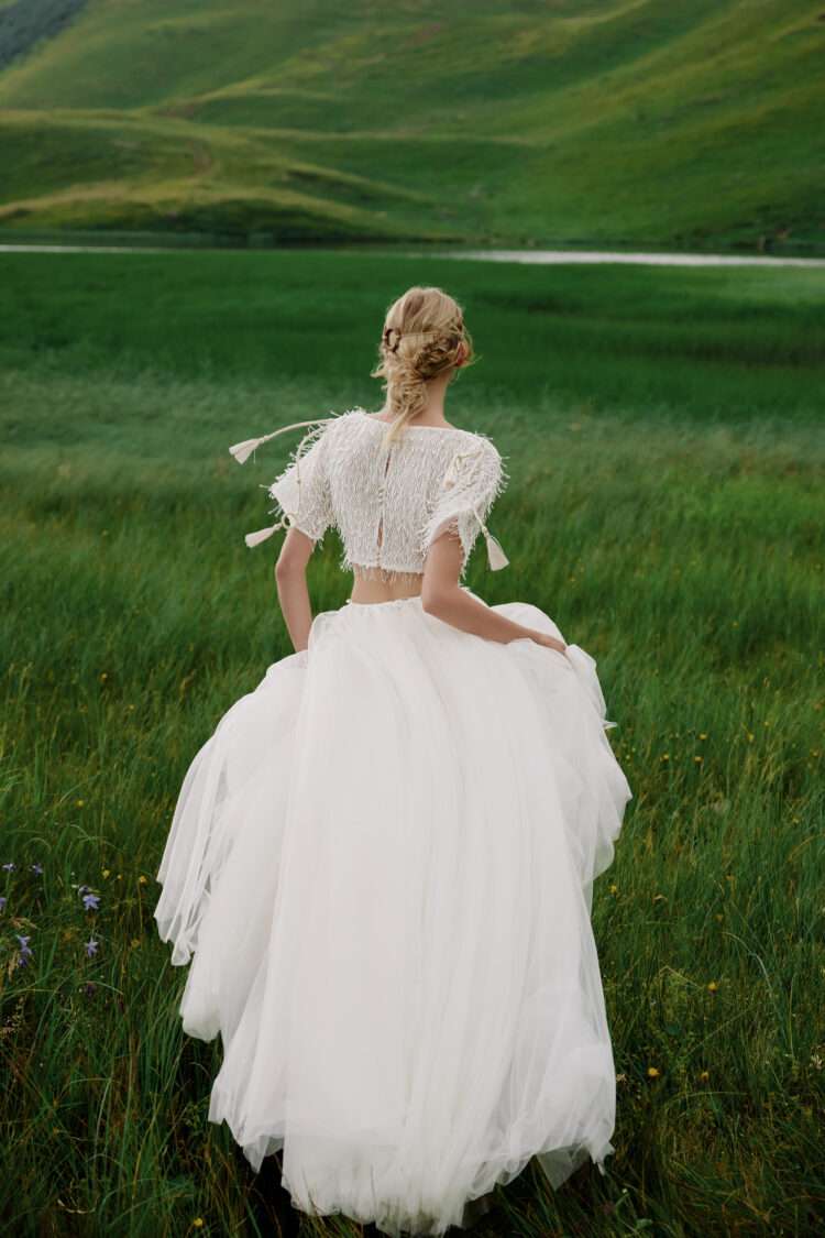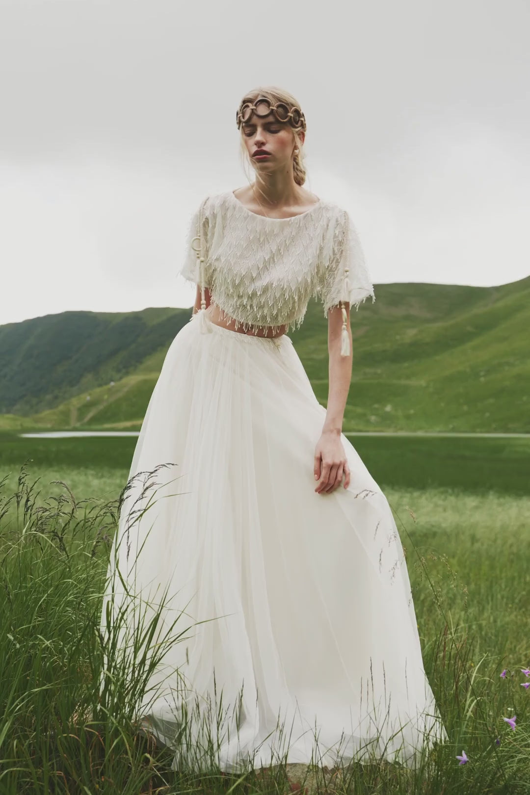 Fancy and stylish two-piece wedding dress which is designed to stand you out among other brides! The lace fringed top with boat neckline, buttoned back and short sleeves is decorated with hand-woven ribbons with wooden beads and rings. You may combine it with an airy multi-layered lace and tulle skirt completed by handmade decor with wood, complete it with any other detail from your wardrobe or use both variations to transform your looks during the whole wedding day.