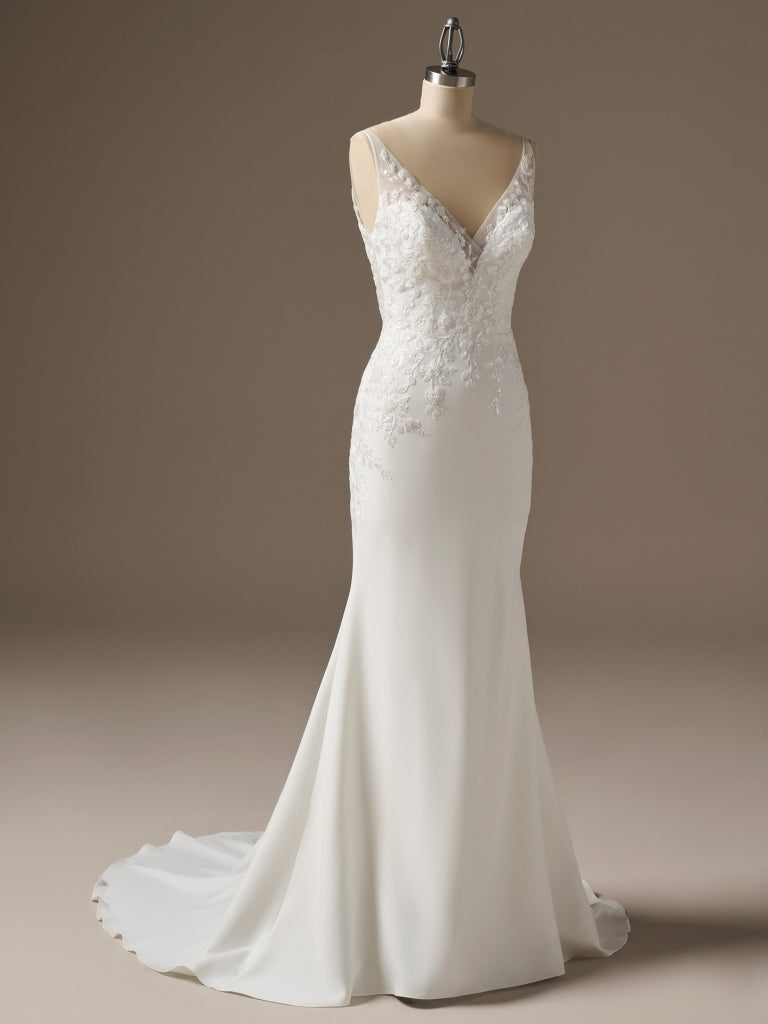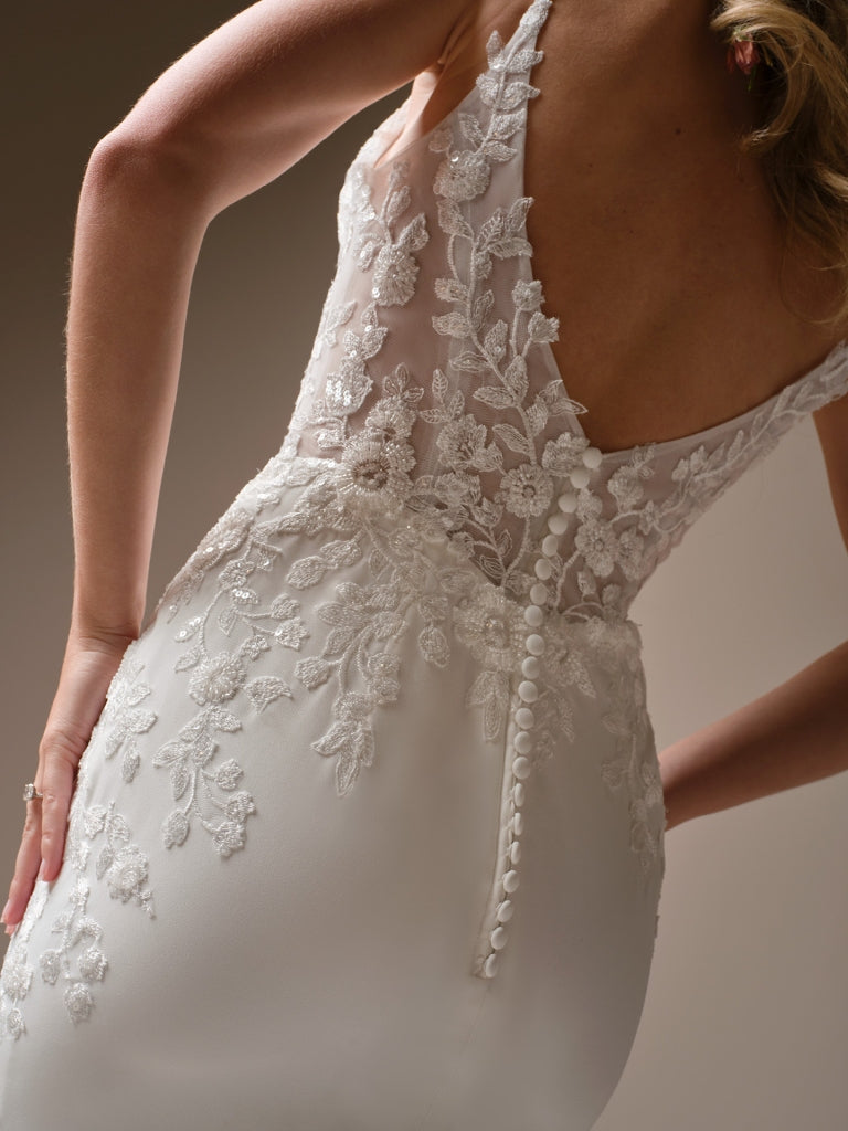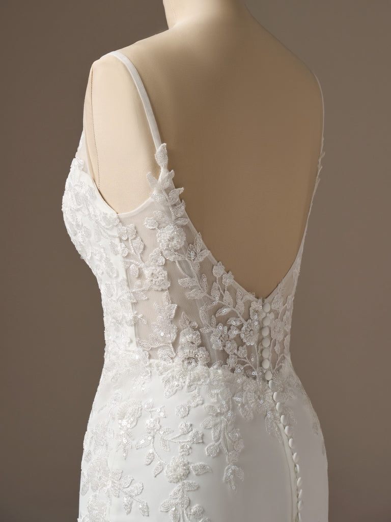 The Holly wedding dress by Rebecca Ingram features a sleek sheath silhouette crafted from future stretch crepe for a flattering fit. Its stunning illusion lace bodice is adorned with beaded and sequin motifs, complemented by a deep V-neckline and crisscross tulle detail for modern elegance. The deep illusion V-back and tulle illusion tank straps add allure, while the Lorena stretch jersey lining ensures comfort all day long. Customize the look by extending or shortening the train, and add covered buttons for a timeless vintage touch. Perfect for brides seeking sophistication with a contemporary edge.
