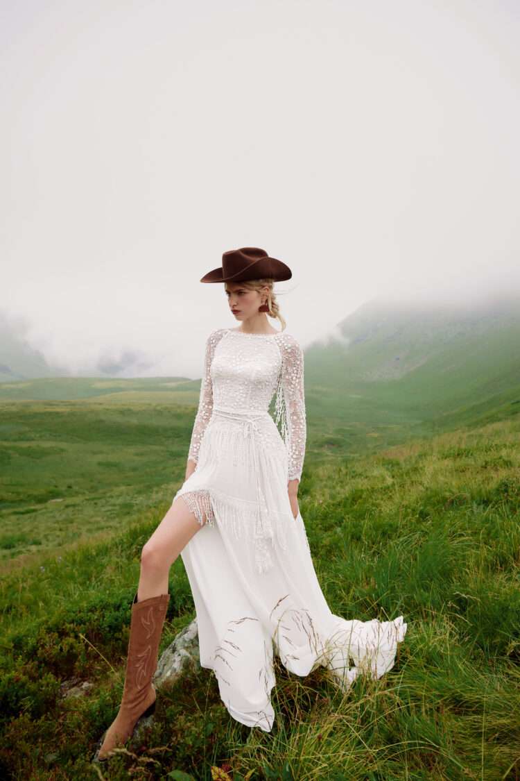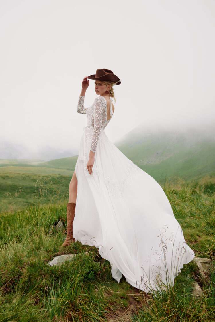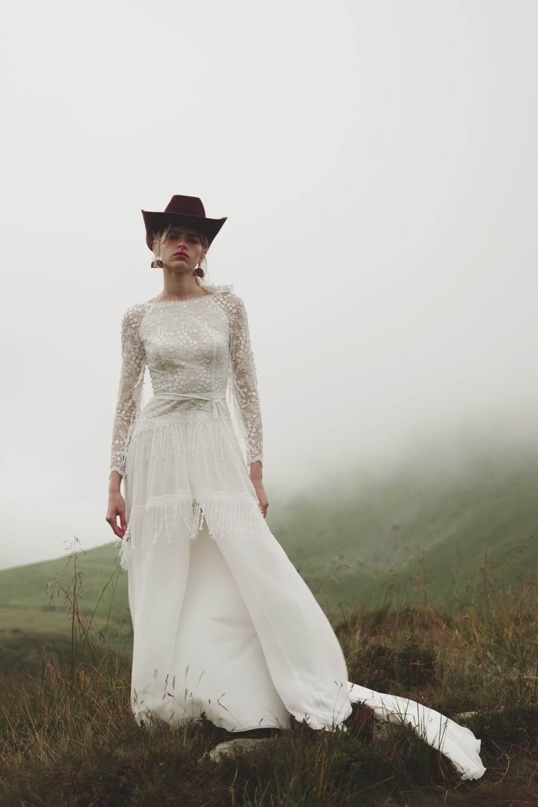 Very sensual and spectacular A-line wedding dress which is suitable not only to create an original bridal look but looks perfect especially for country-stylized weddings. Lace boat top with V-cutout back completes with long slim sleeves decorated with handmade macrame ribbons, and also with airy same-decorated chiffon skirt with the train and seductive thigh-high cutting. The waistline is completed with a hand-woven cord. This bridal dress looks really special and, of course, will stand you out among other happy brides!