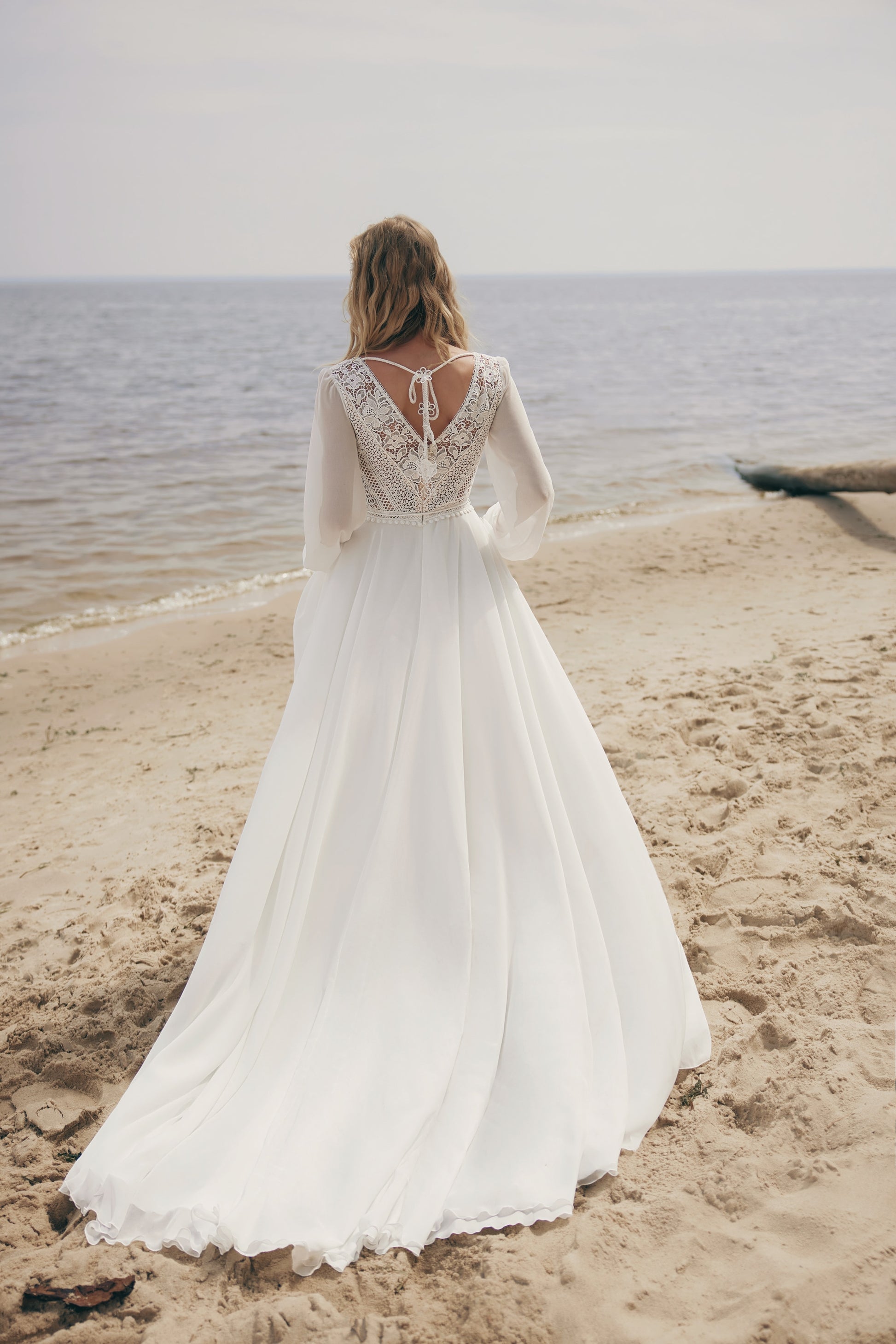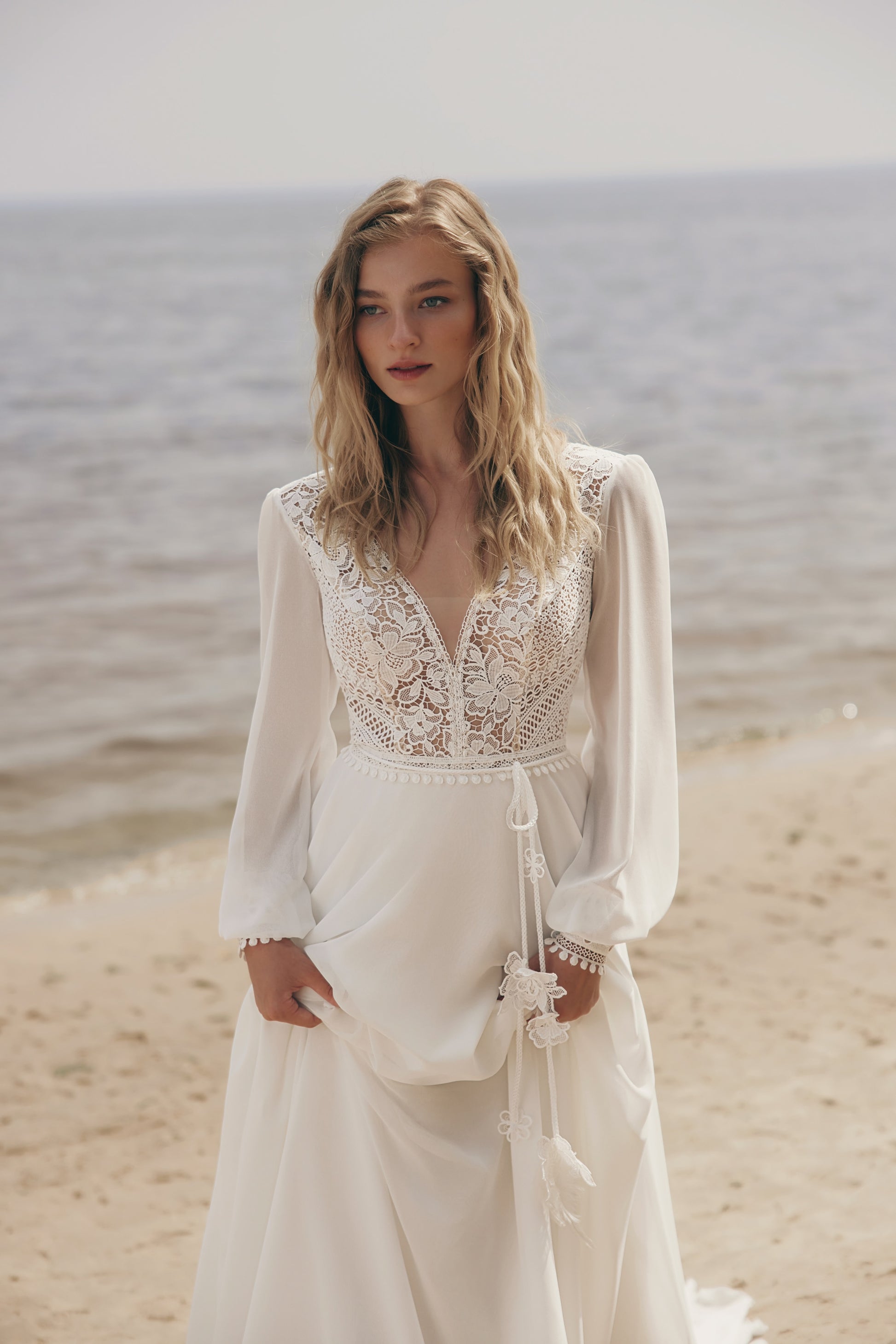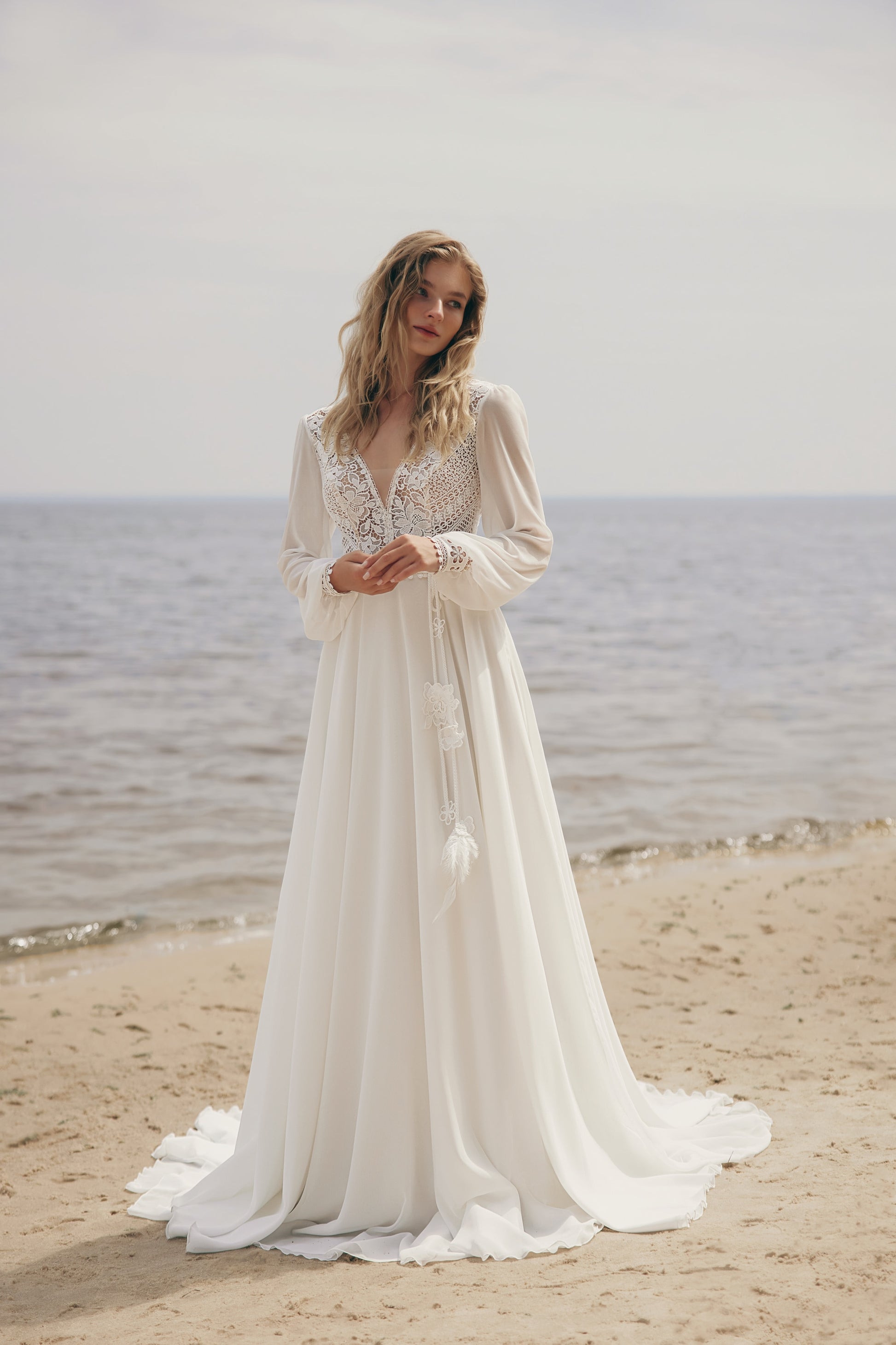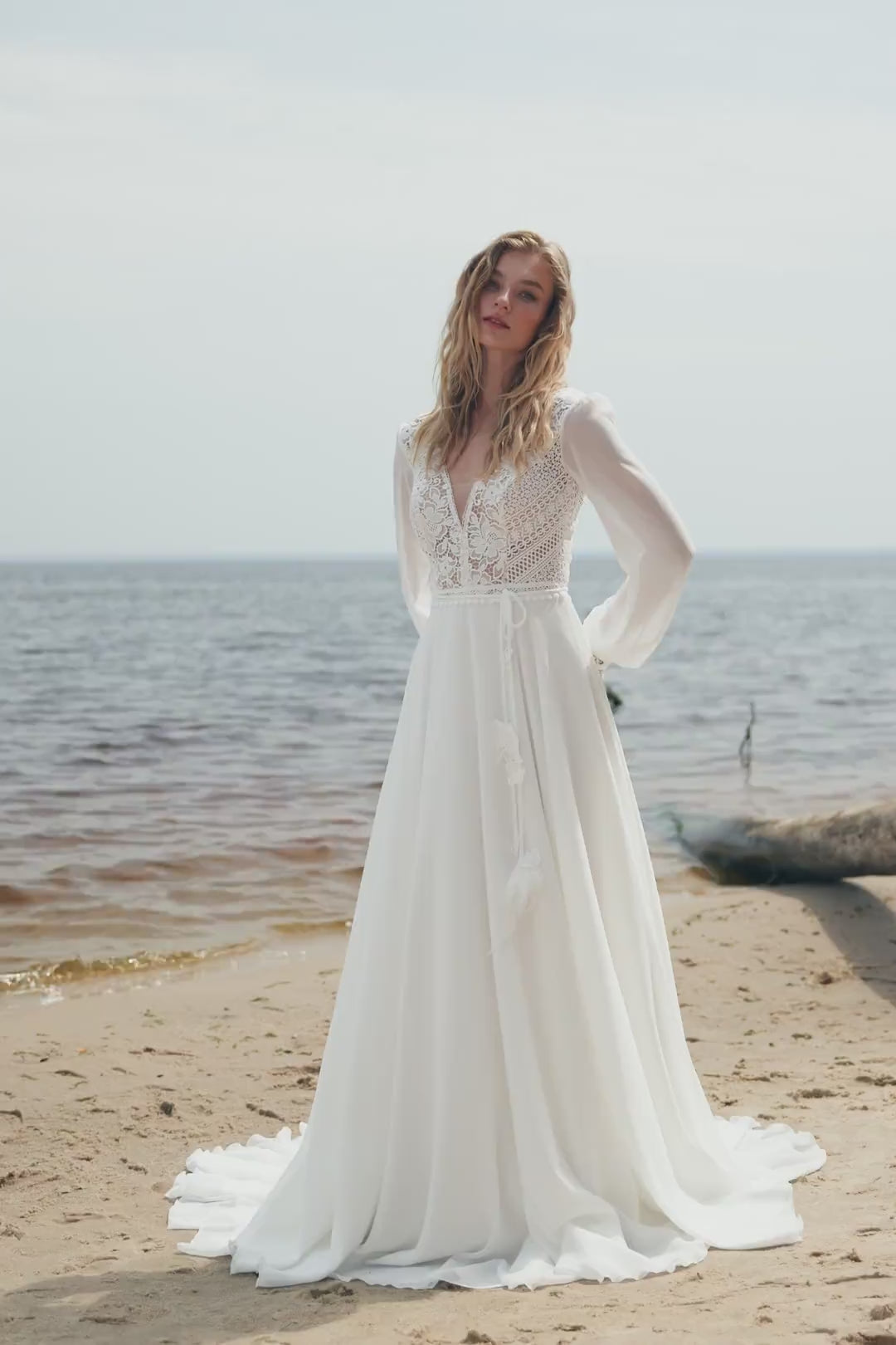 “Just the Two of Us” wedding gown is the fulfillment of bohemian elegance where romance perfectly merges with timeless sophistication. To achieve this A-line silhouette, lightweight lace and floating chiffon have been used. It will make the bride look ethereal, airy, and in a flow when she walks in it. The deep V-neckline adds to the dress’s modern appeal, cleverly balanced by the long bell-shaped sleeves with their own take of vintage charm and grace. Intricate macrame ribbons and a handmade belt define the waist, bringing all attention to the female form without ever sacrificing comfort. This is indeed a gown to boast of—one of love and free-spirited beauty for brides who have dreamed of relaxed yet enchanting beachside or boho-chic nuptials.