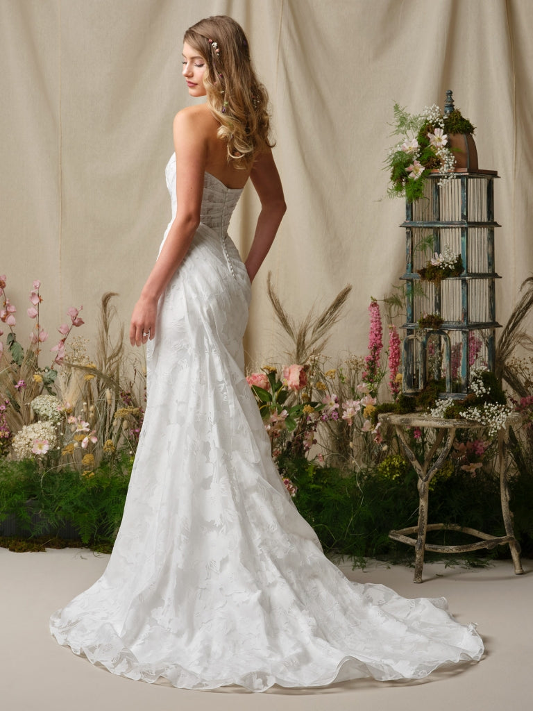 The Kendall wedding dress by Rebecca Ingram combines elegance and modern design with its printed organza fabric and sleek sheath silhouette. Featuring an illusion bodice with exposed boning and a flattering basque waist, this gown highlights a distinctive cat eye neckline for a sophisticated statement. Fully lined in Rosario crepe back satin, it ensures comfort and a luxurious feel. Finished with covered buttons over a zipper closure, Kendall offers a refined look perfect for brides seeking timeless beauty with contemporary flair.