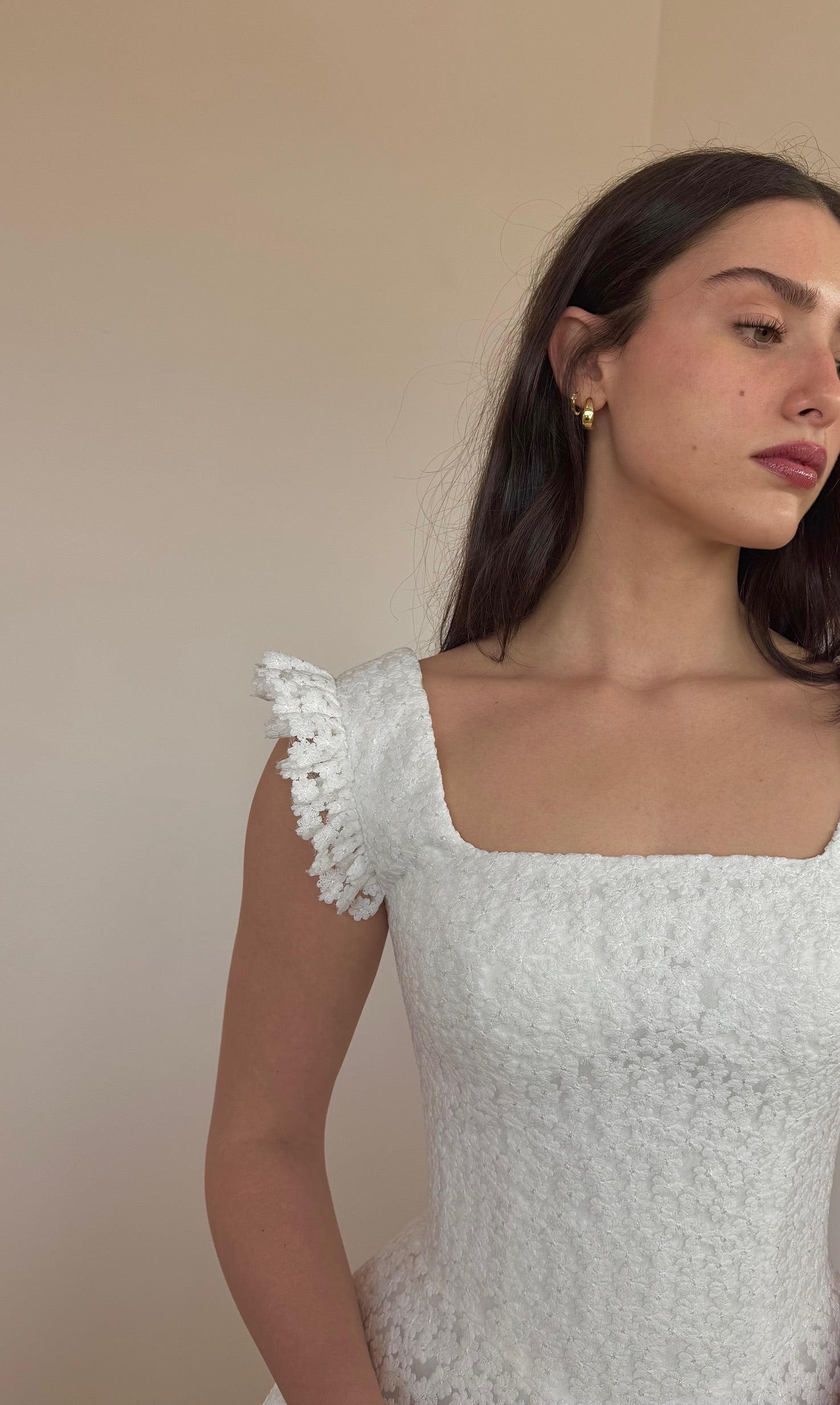 Lillian features exquisite all-over intricate lace adorning a graceful soft A-line silhouette. The flattering basque waist creates elegant definition, while delicate ruffle tank straps provide romantic detail and comfortable support. This stunning wedding dress combines timeless elegance with modern sophistication, perfect for the bride seeking intricate craftsmanship and refined style on her special day.