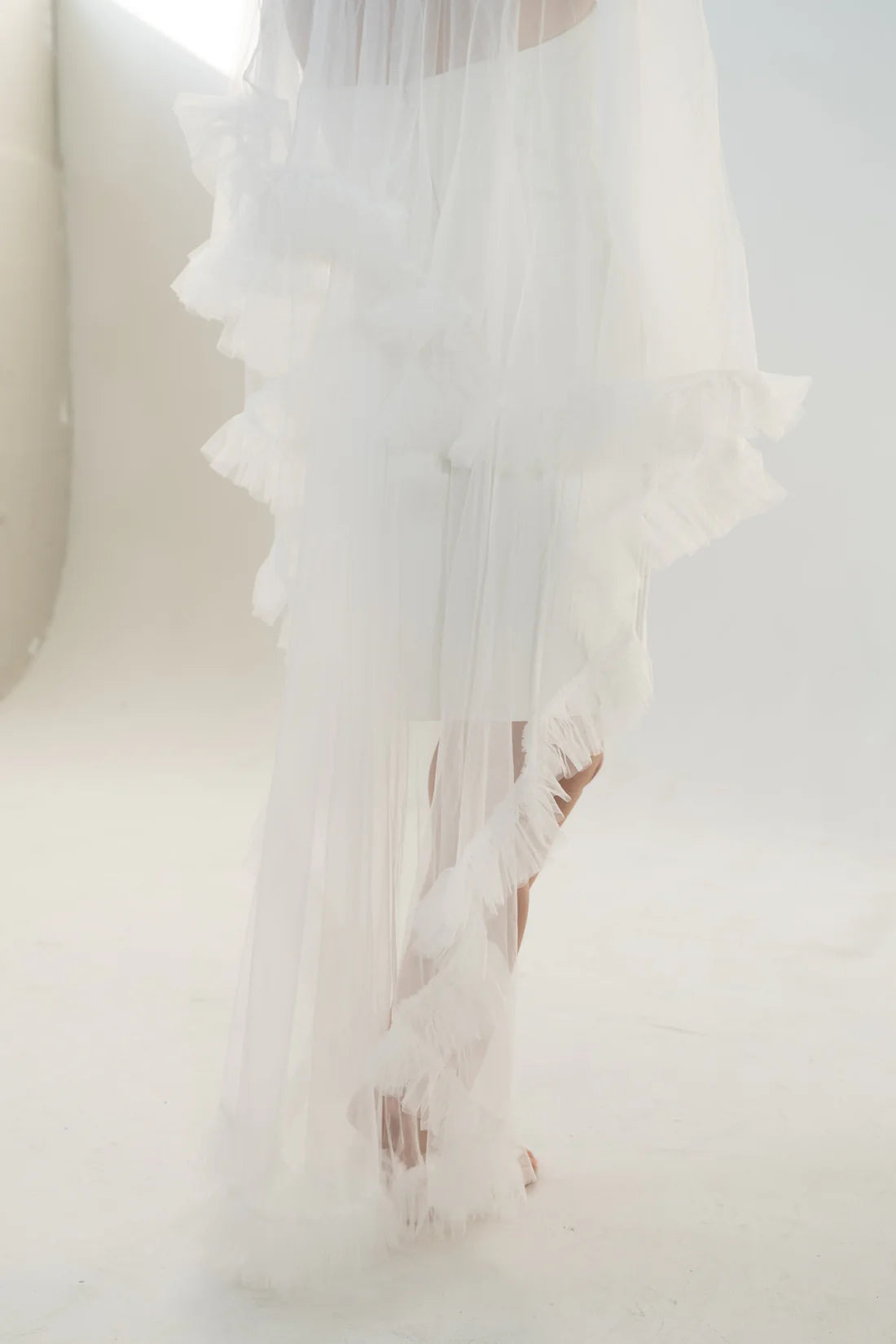 The Monroe is a two-tier veil crafted from our signature Heirloom Tulle™, featuring an elbow-length blusher and waltz-length bottom tier. A soft ruffle trim outlines both layers, offering movement and volume in a more wearable version of our bestselling dramatic ruffle veil. Versatile, modern, and full of personality—perfect for city weddings, second looks, or statement styling.