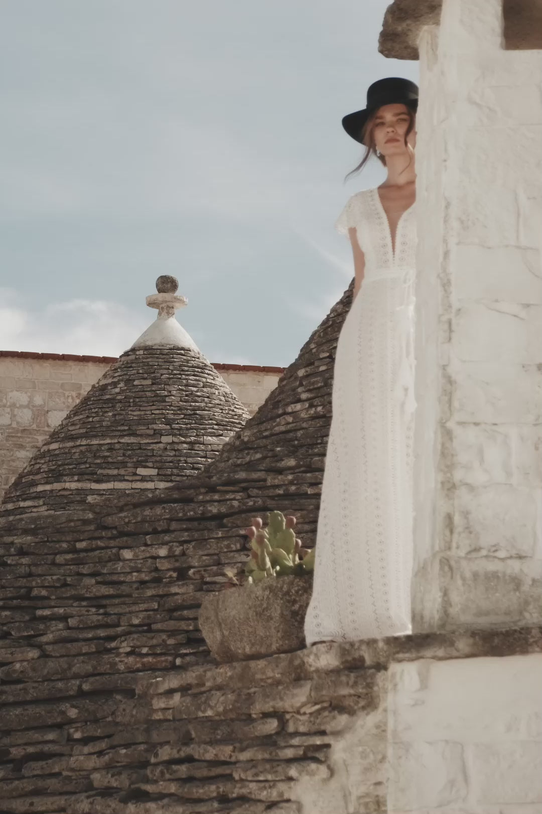 The Moondust by Ariamo Boho wedding dress features a distinctive lace design that perfectly embodies bohemian elegance. Its light, flowing silhouette paired with delicate lace details offers a romantic and natural appearance while providing all-day comfort. This gown is perfect for brides who want to celebrate their unique style with timeless sophistication on their wedding day.