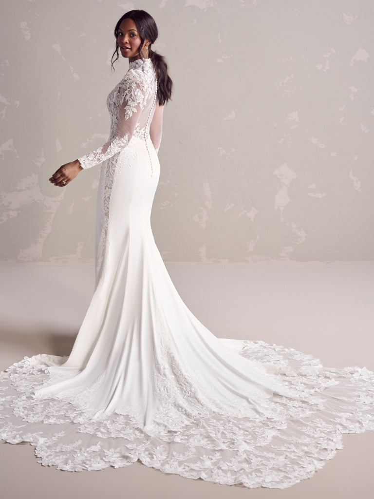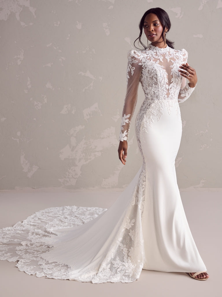 Present yourself in timeless grace and sophistication on your special day in this beautiful Nash by Sottero and Midgley gown. An illusion lace mock neck and long fitted sleeves offer romantic glamour, while the Panama crepe fit-and-flare skirt reveals delicate floral details to complete the look. This exquisite dress is finished with a deep illusion back, side illusion detail lined with Chantilly lace, and a double scallop illusion lace train. A perfect combination of beauty and comfort!
