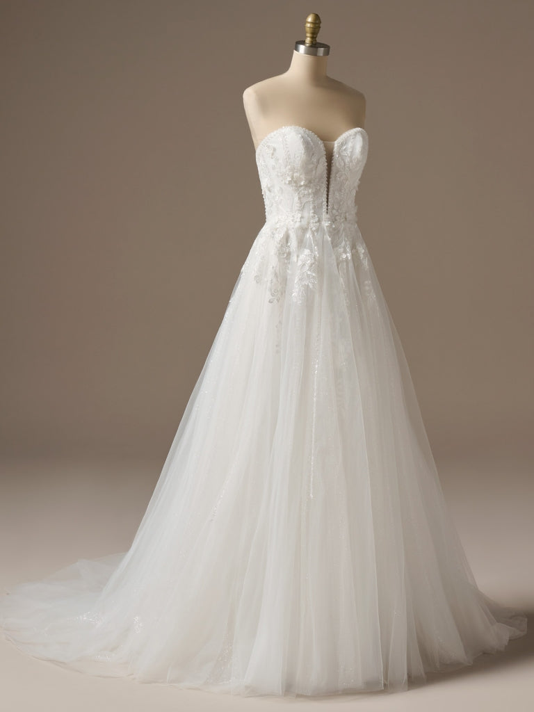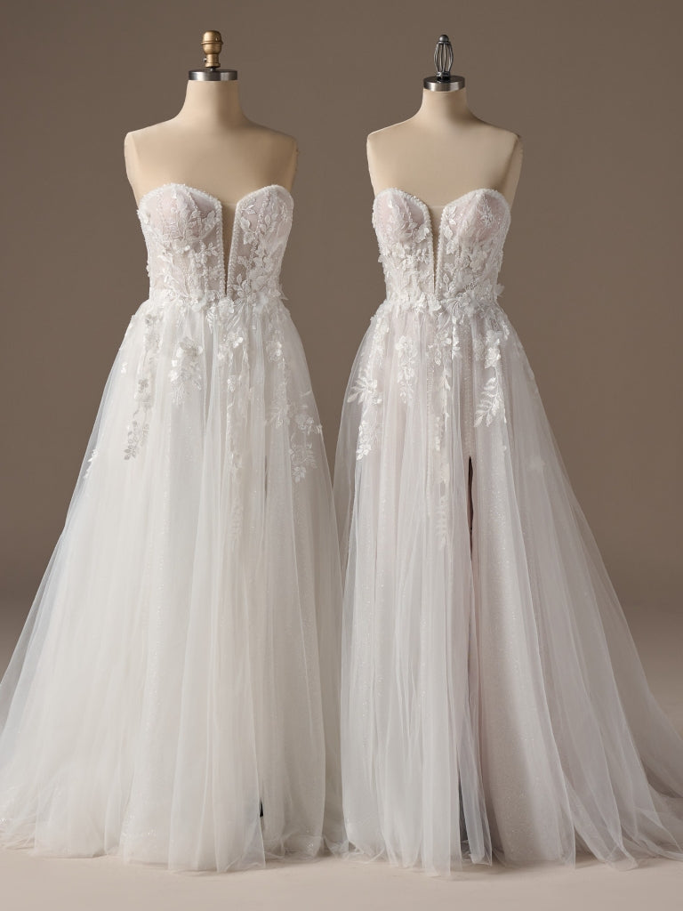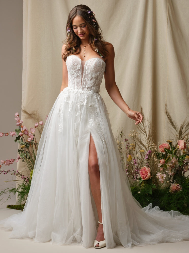 Nora by Rebecca Ingram is a whimsical A-line wedding dress featuring exquisite 3-D lace embellished with beads and sequins layered over glittering tulle. The strapless sweetheart bodice includes a sheer organza lining and a daring illusion plunge neckline, complemented by a deep sheer lace V-back for a captivating silhouette. A side slit adds movement and allure, while a covered button-over-zipper closure ensures a polished finish. Customize your look with optional vintage-style buttons down the back or a fully lined bodice with inner elastic for comfort. Extra lace motifs allow subtle neckline adjustments for a perfect fit.