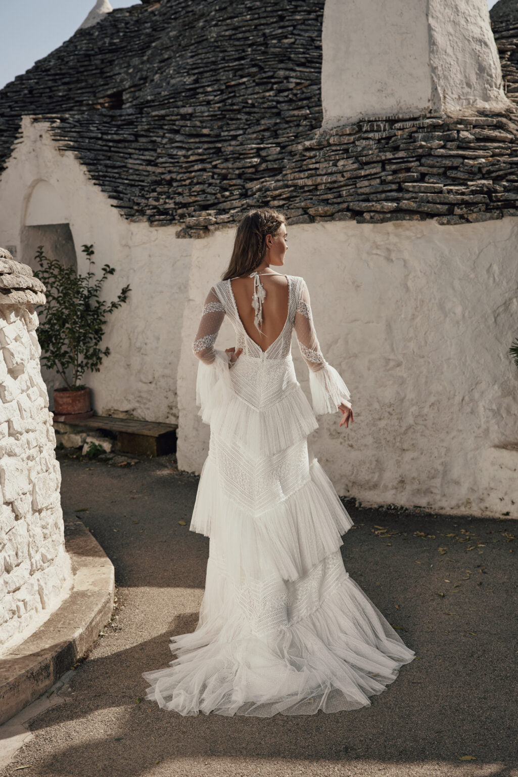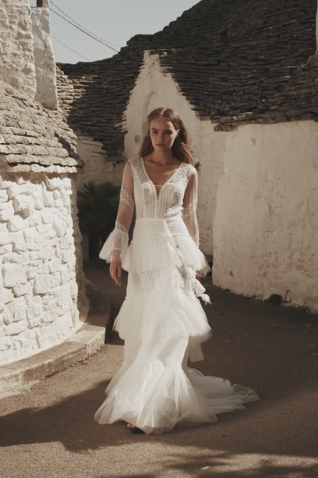 The Pearl by Ariamo Boho wedding dress features a distinctive lace design that perfectly embodies bohemian elegance. Its light, flowing silhouette paired with delicate lace details offers a romantic and natural appearance while providing all-day comfort. This gown is perfect for brides who want to celebrate their unique style with timeless sophistication on their wedding day.