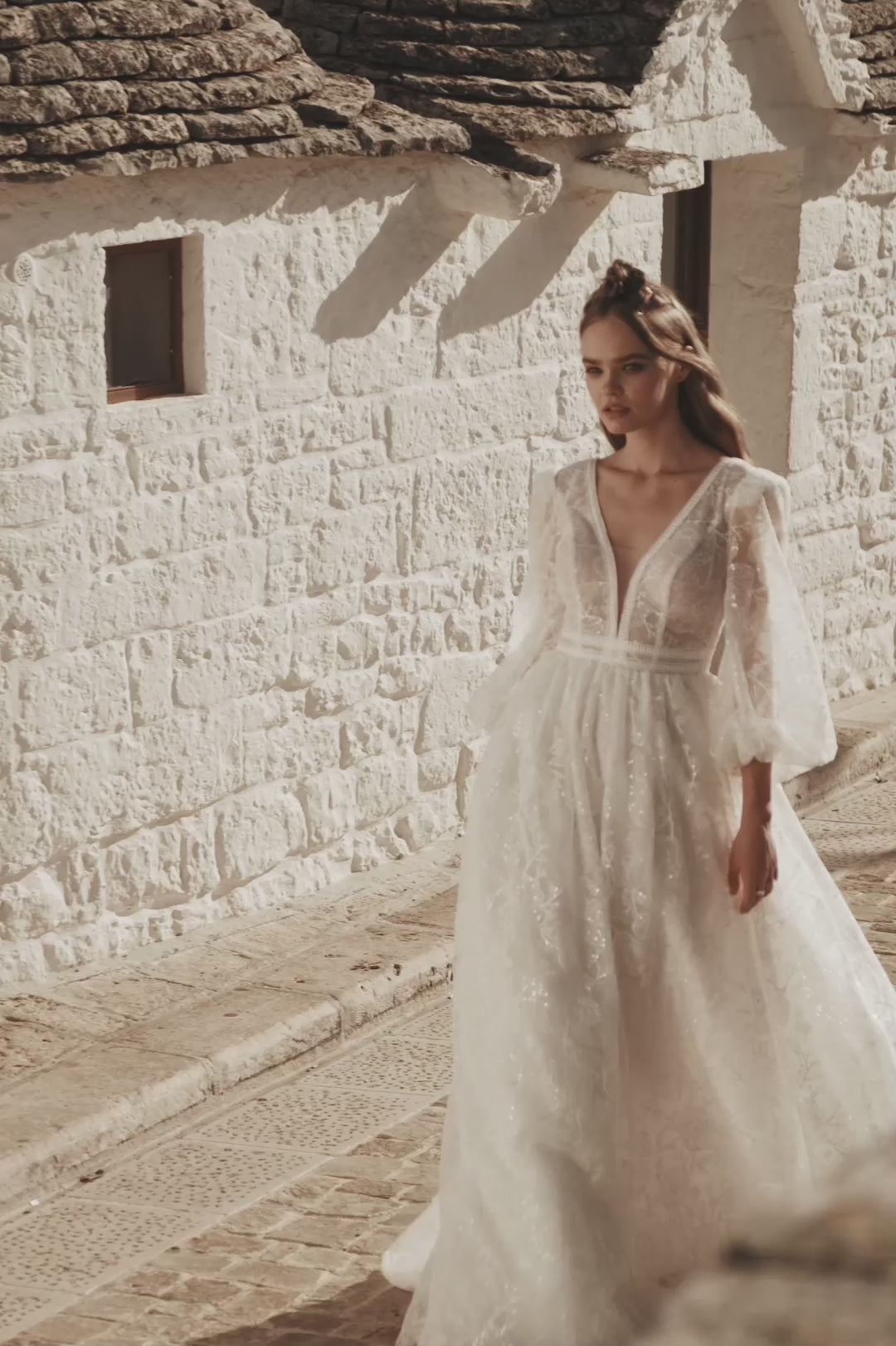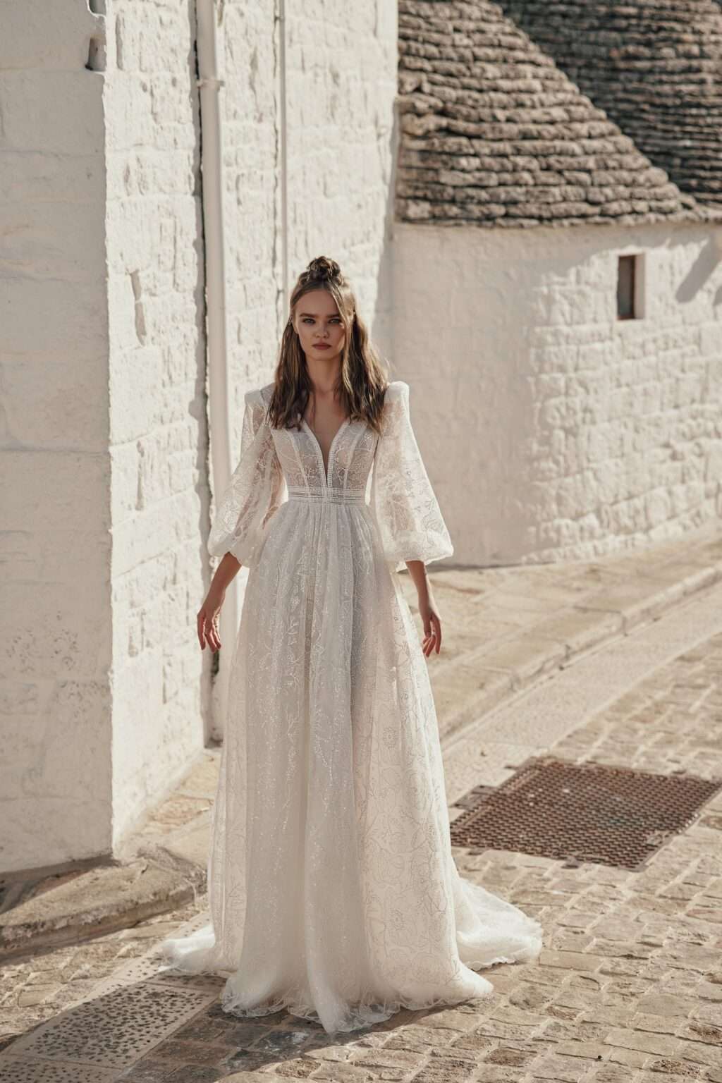 The Serenity Sanctuary by Ariamo Boho wedding dress features a distinctive lace design that perfectly embodies bohemian elegance. Its light, flowing silhouette paired with delicate lace details offers a romantic and natural appearance while providing all-day comfort. This gown is perfect for brides who want to celebrate their unique style with timeless sophistication on their wedding day.