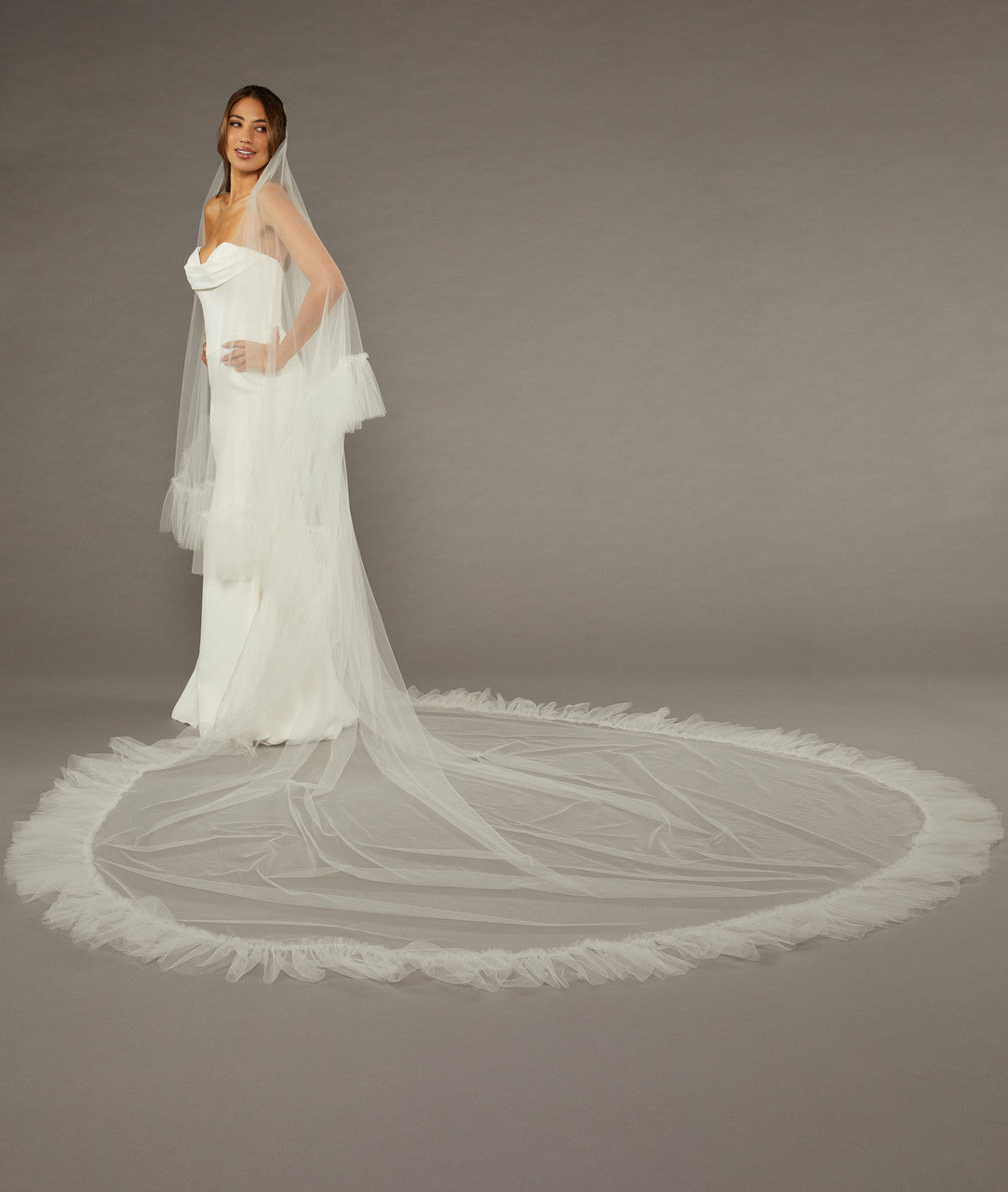 Elevate your bridal look with the V2490WRC-M - Envogue veil. Made from soft tulle, the wide royal cathedral mantilla style features a raw edge ruffle and blusher for a touch of luxury. Measuring 36" long and 108" wide, it adds a romantic and elegant touch to your ensemble. Available in ivory.