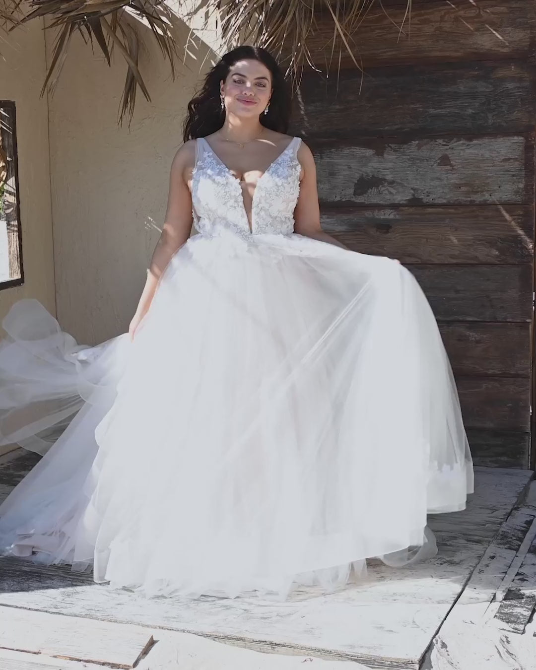 Winona by Rebecca Ingram is a romantic asymmetrical bridal dress with a plunging illusion V-neckline. This piece features unembellished lace motifs over tulle and an illusion pleated bodice. The deep V-back and illusion pleated tulle tank straps create a flattering silhouette. Handkerchief horsehair hem ruffles complete the look and you can customize it with covered buttons down the back for a vintage vibe. Also available with a lined front bodice, and extra lace motif included for alterations. Gown is photographed in Ivory over Nude and featured on our curve model in Ivory over Blush
