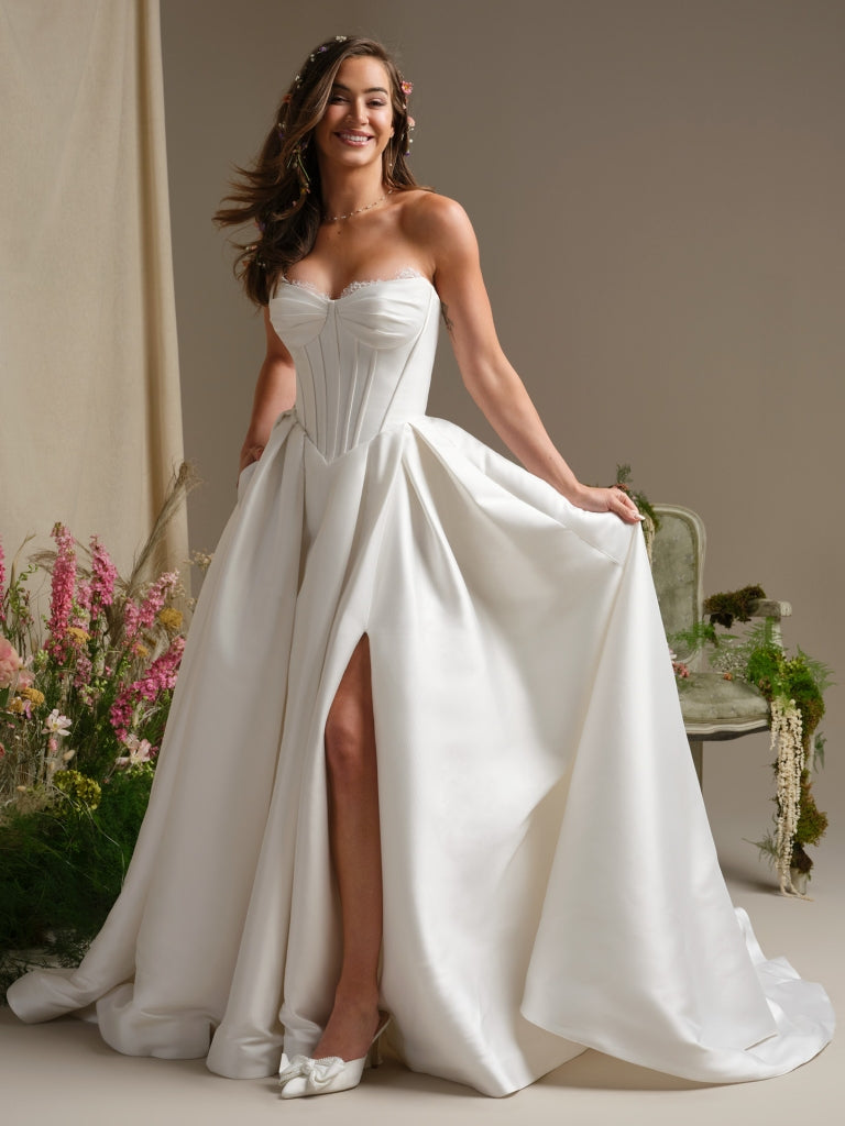 Experience elegance with the Zorina by Rebecca Ingram, a Mikado ballgown that combines classic structure and modern details. Featuring a flattering Basque waistline and exposed boning, this gown enhances your silhouette with subtle support. The sweetheart neckline is beautifully accented with peekaboo lace trim, while a daring side slit adds a touch of allure. Practical pockets and a variety of sleeve options—including detachable off-the-shoulder pleated cap-sleeves and corded overlace flare sleeves—allow you to personalize your look. Crafted with eco-friendly Kahili lining and finished with covered buttons trailing to the hem, Zorina blends style, comfort, and sustainability perfectly.